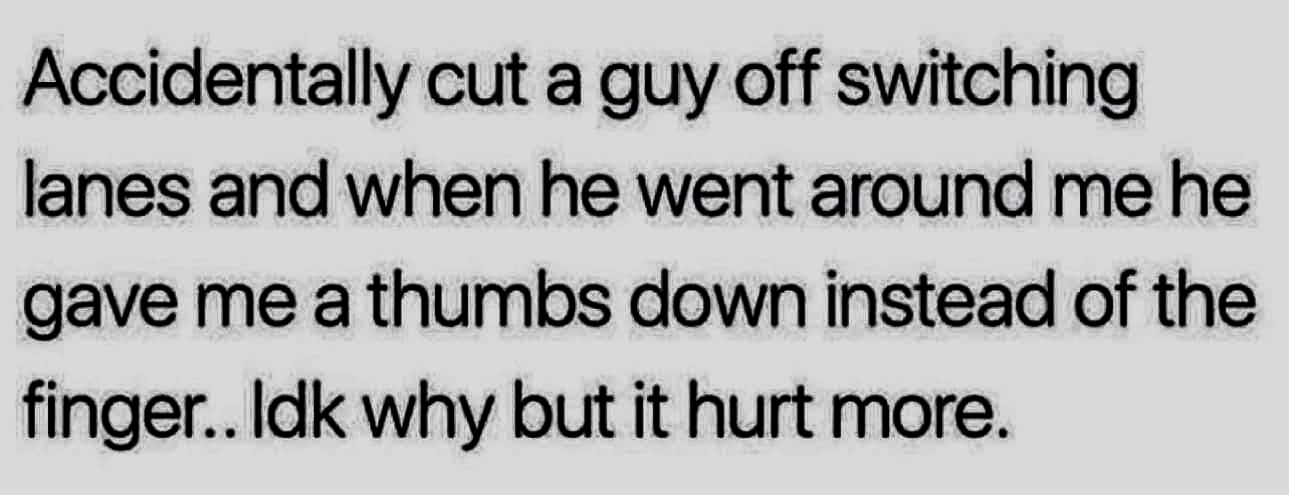 1778 Wildwildworld 2 года назад Юмор для всех и каждого Загадочная душа Случайно подрезал парня и он показал мне жест кулаком с большим пальцем вниз вместо фака. Не знаю, почему, но это обидело меня куда больше. Скриншот Юмор Подрезал Жесты Зашакалено 3 1 Ещё 0