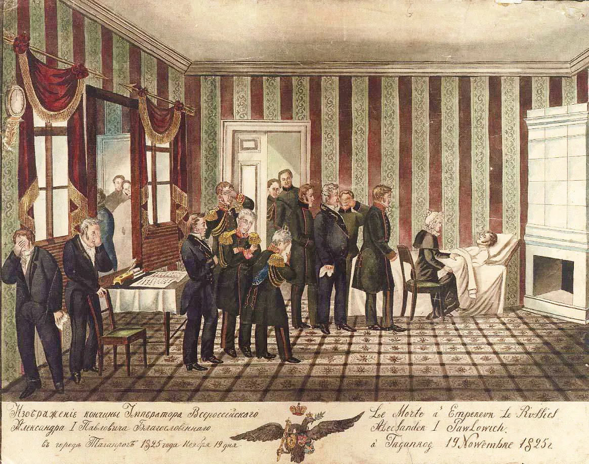 Вроде бы ещё совсем недавно Александр I заставил капитулировать Наполеона, показывая всему миру, что Россия — величайшая империя в Европе. И тут, всего за пару дней, внезапно умирает в каком-то провинциальном городе. Тем более что под конец правления император всё больше увлекается мистикой и буквально мечтает отречься от престола. Тело императора после его смерти сразу же прячут от глаз приближённых и простых людей. Из-за этого даже поднялся небольшой бунт, но его быстро подавили. Александра не могут похоронить почти 4 месяца —погребение состоялось в марте следующего года.