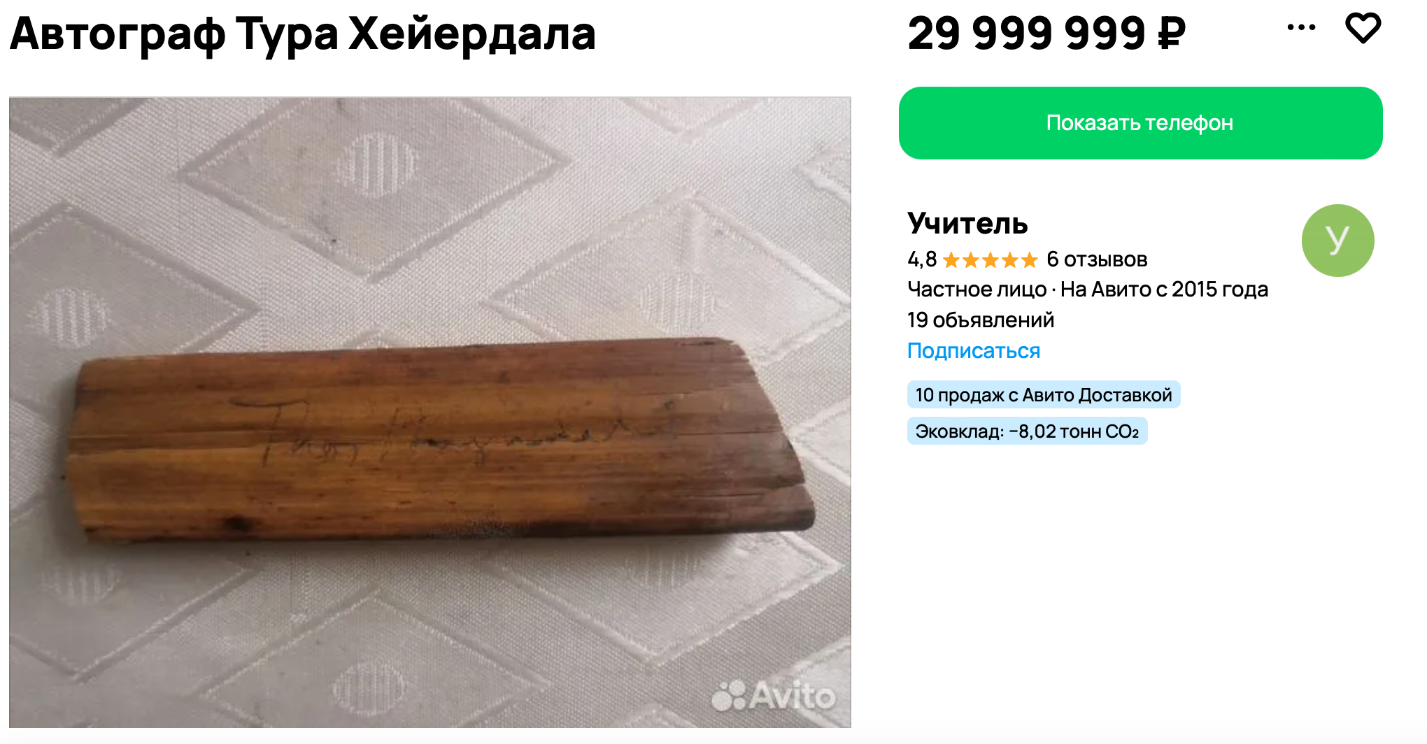 И финал — роскошный. Автограф Тура Хейердала. На папирусе. Или на куске его плота «Кон-Тики». Или на базальте. Продавец не уверен, из чего именно сделана эта реликвия, но зато уверен в цене: 30 миллионов. Документов, подтверждающих подлинность, нет, но есть мнение «одного человека, который разбирается в антиквариате» — он глянул и сказал: да, вещь стоящая.