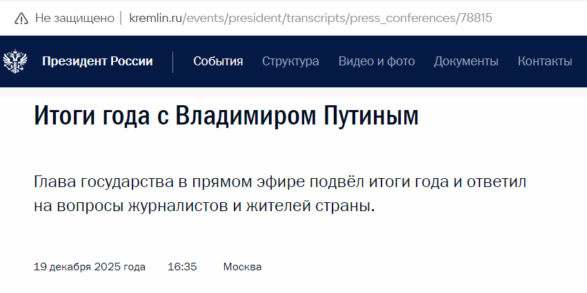 Источник - официальный сайт Кремля, стенограмма прямой линии 19.12.2025
