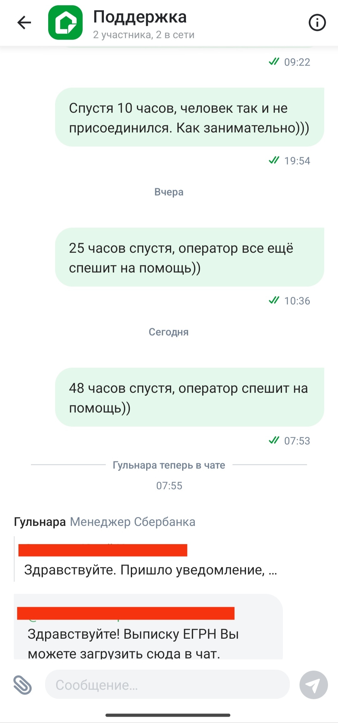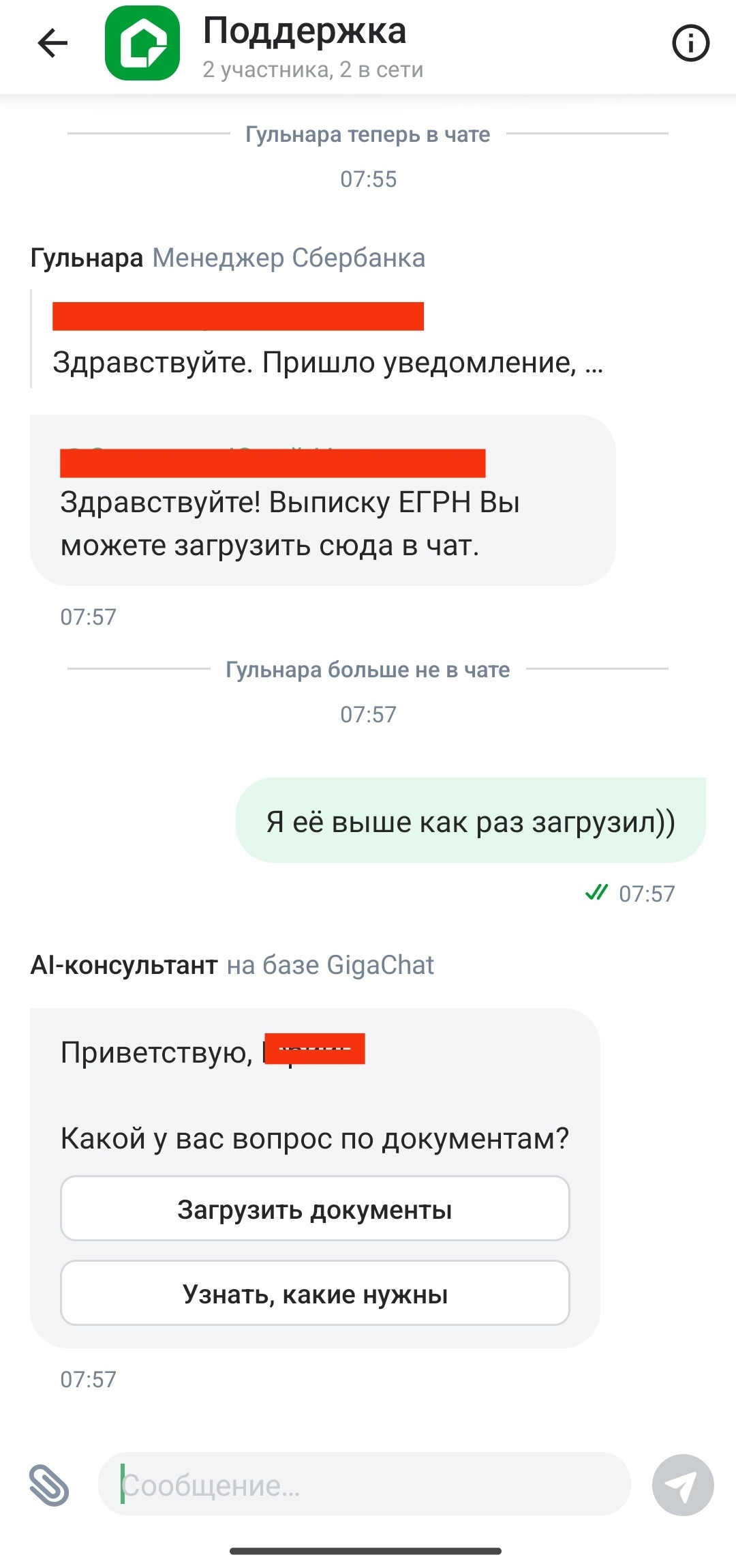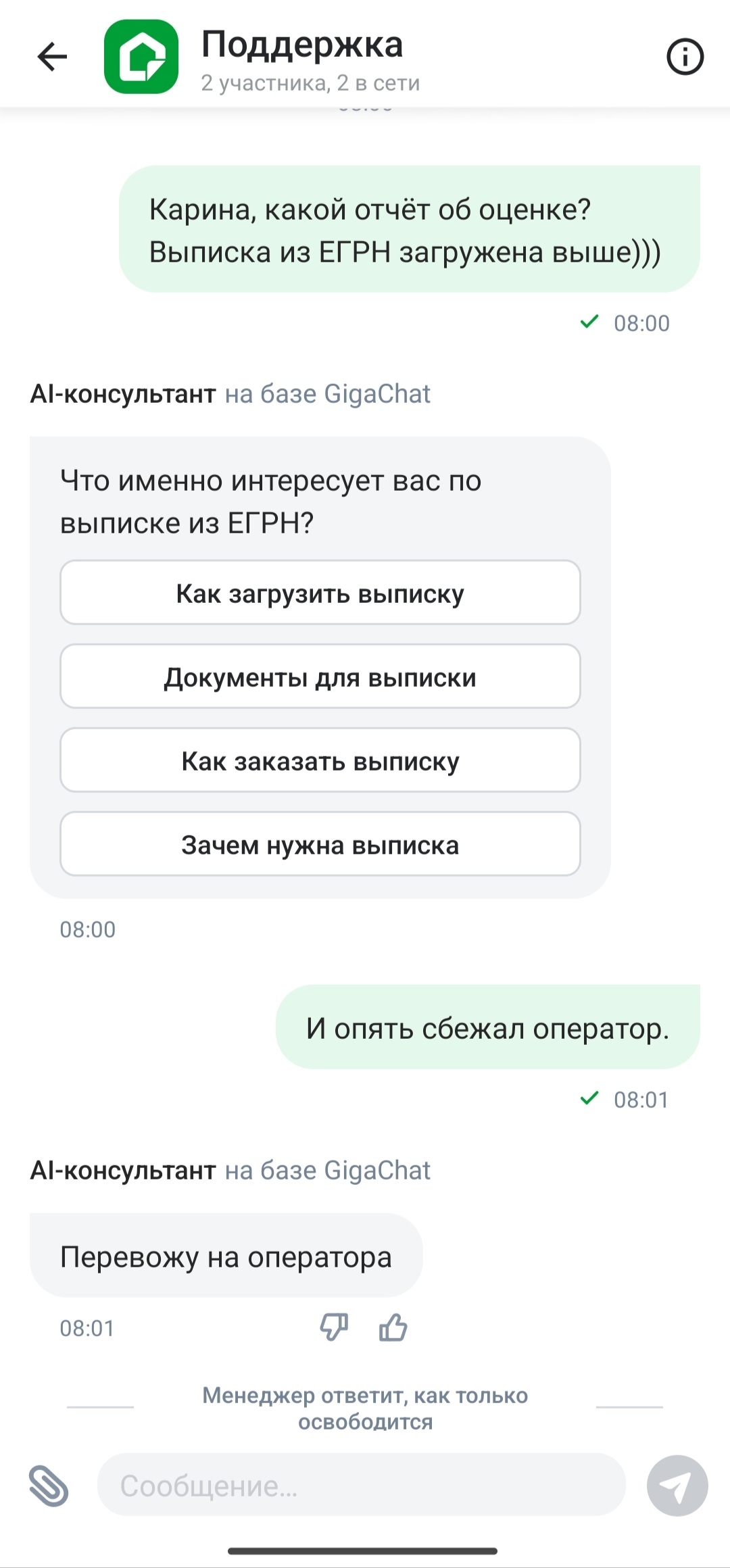 Сомнительно, но окей. Ведь есть же чат поддержки. Открываю этот самый чат, загружаю туда PDF с выпиской ЕГРН. И пишу, мол так и так, пришло уведомление, просьба загрузить, та как у личного кабинета лапки.