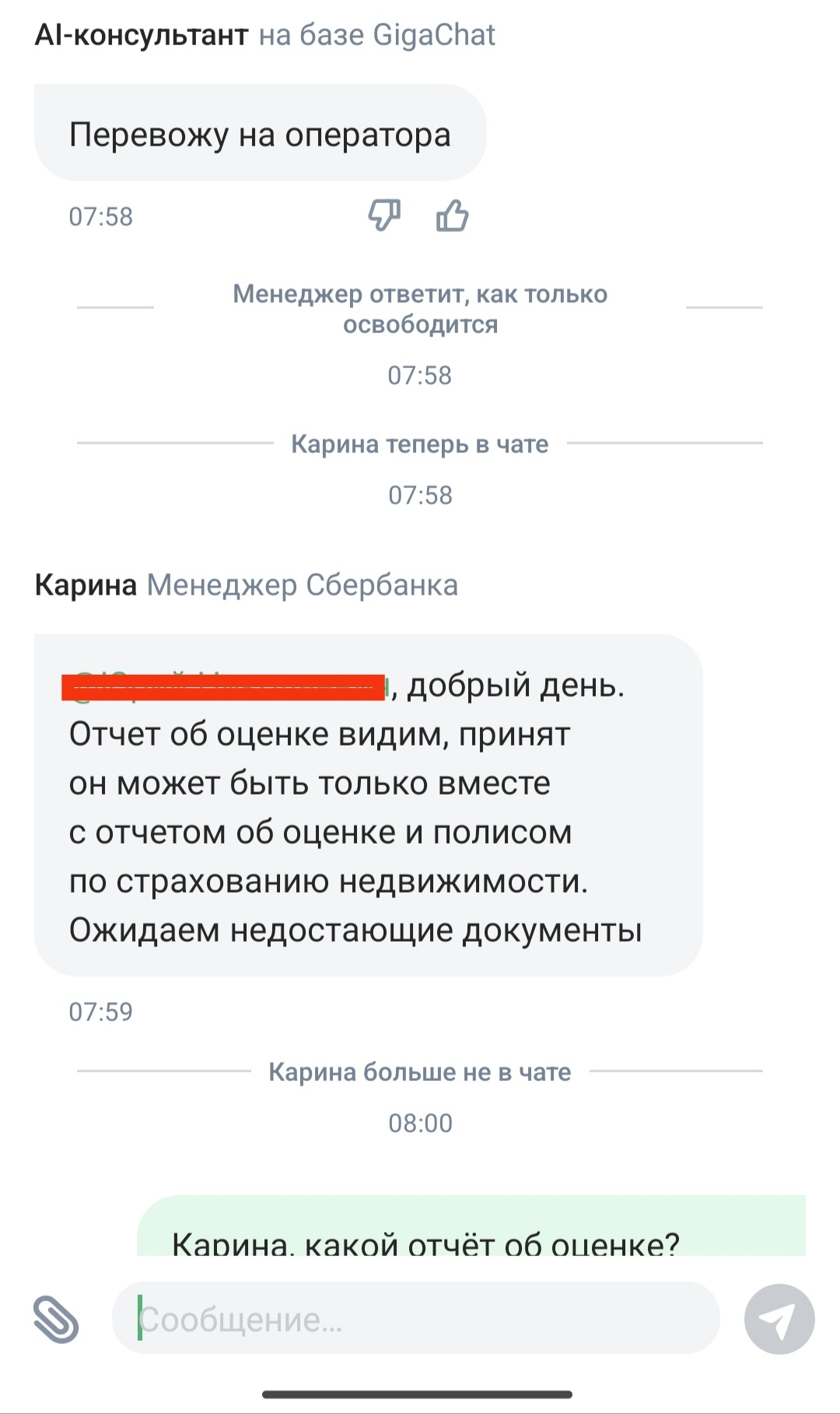 И тут на сцену выходит новый герой - оператор Карина. Надежда снова теплится! Карина, видимо, ознакомилась с историей моего диалога (шучу, конечно, никто там ничего не читает) и выдает: "Документы по страховке и отчётом по оценке мы видим, ожидаем загрузки остальных". Страховке? Какой блин страховке? @Sber,У нас тут пропала выписка из Росреестра. Такое чувство, что ваши операторы поддержки и НЕЧТО, которое генерит названия для продуктов икеи, сидят в одном кабинете.