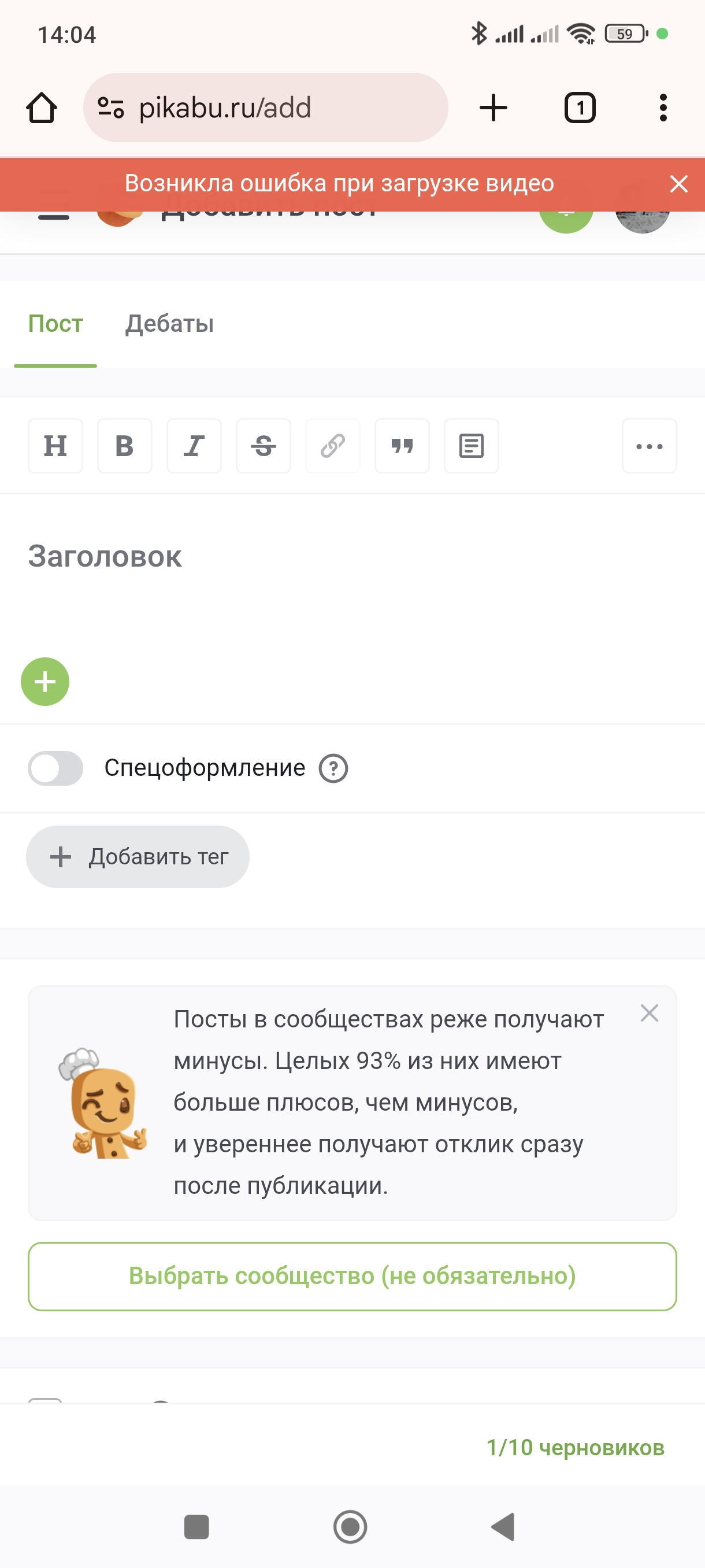0 Есть официальный ответ Mikenine Багрепорты Загрузка видео 4 месяца назад Не загружается видео на Пикабу . Хотя все условия соблюдены. Весит меньше 500 мр4.специально подогнал под рамки размещения. Через ссылку добавлять не хочу рутубом не пользуюсь, принципиально. Ютьюб не везде работает. Что я делаю не так? Сайт Приложение Пикабу Добавление постов Длиннопост Ещё 0