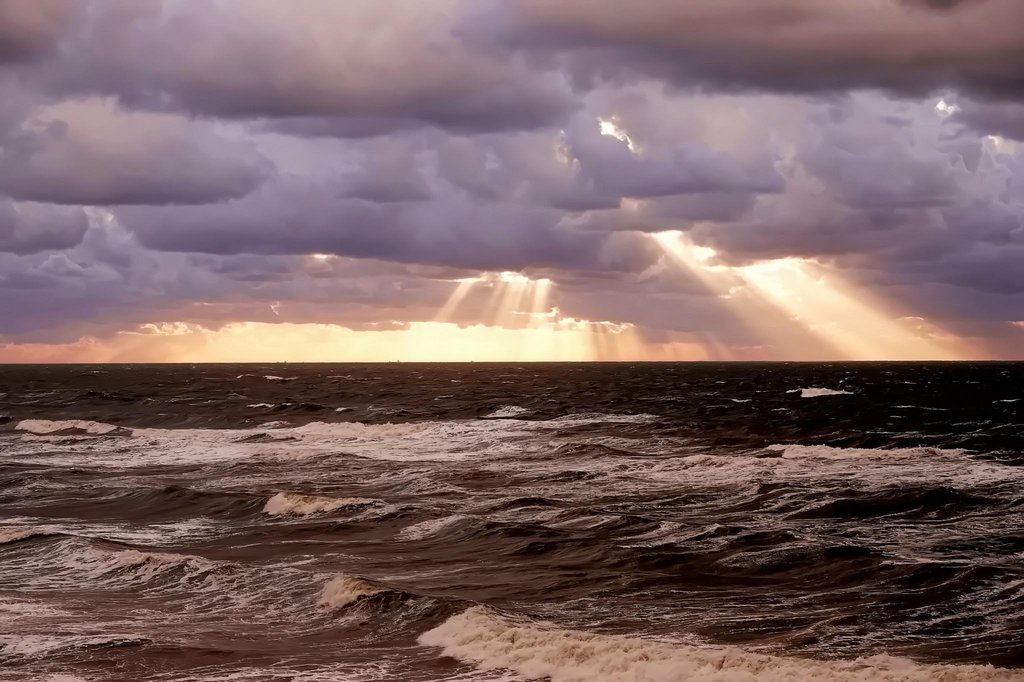 Закат на море. Выглядит драматично. Была неустойчивая погода - то дождь, то солнце, то град. Ветер метался. Море бушевало. Тучи закрывали небо, сквозь них пробивались лучи...
