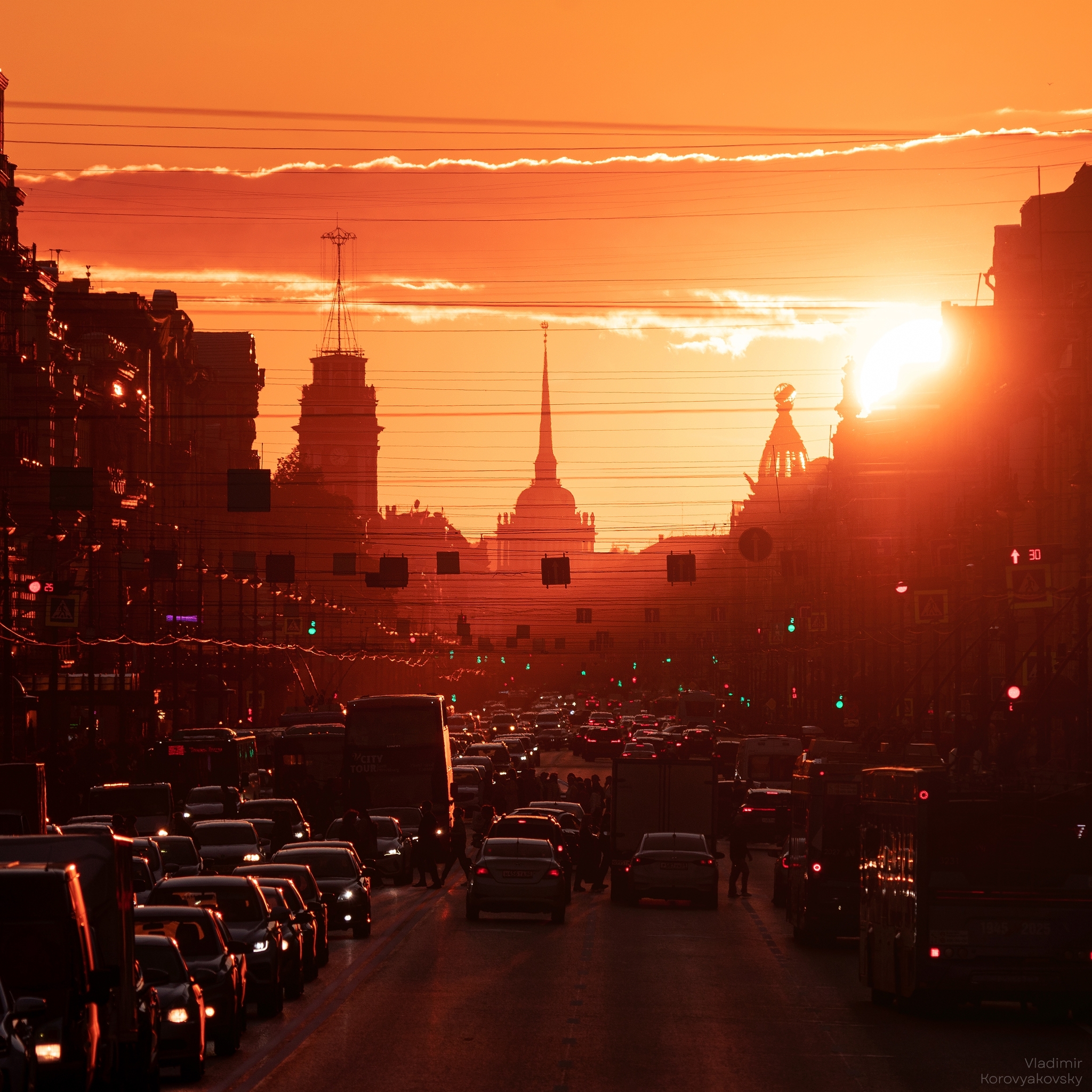 Два раза в год, по большому счёту, точно так же, как и со всеми остальными ракурсами, есть возможность снять заход Солнца ровно за шпилем Адмиралтейства.