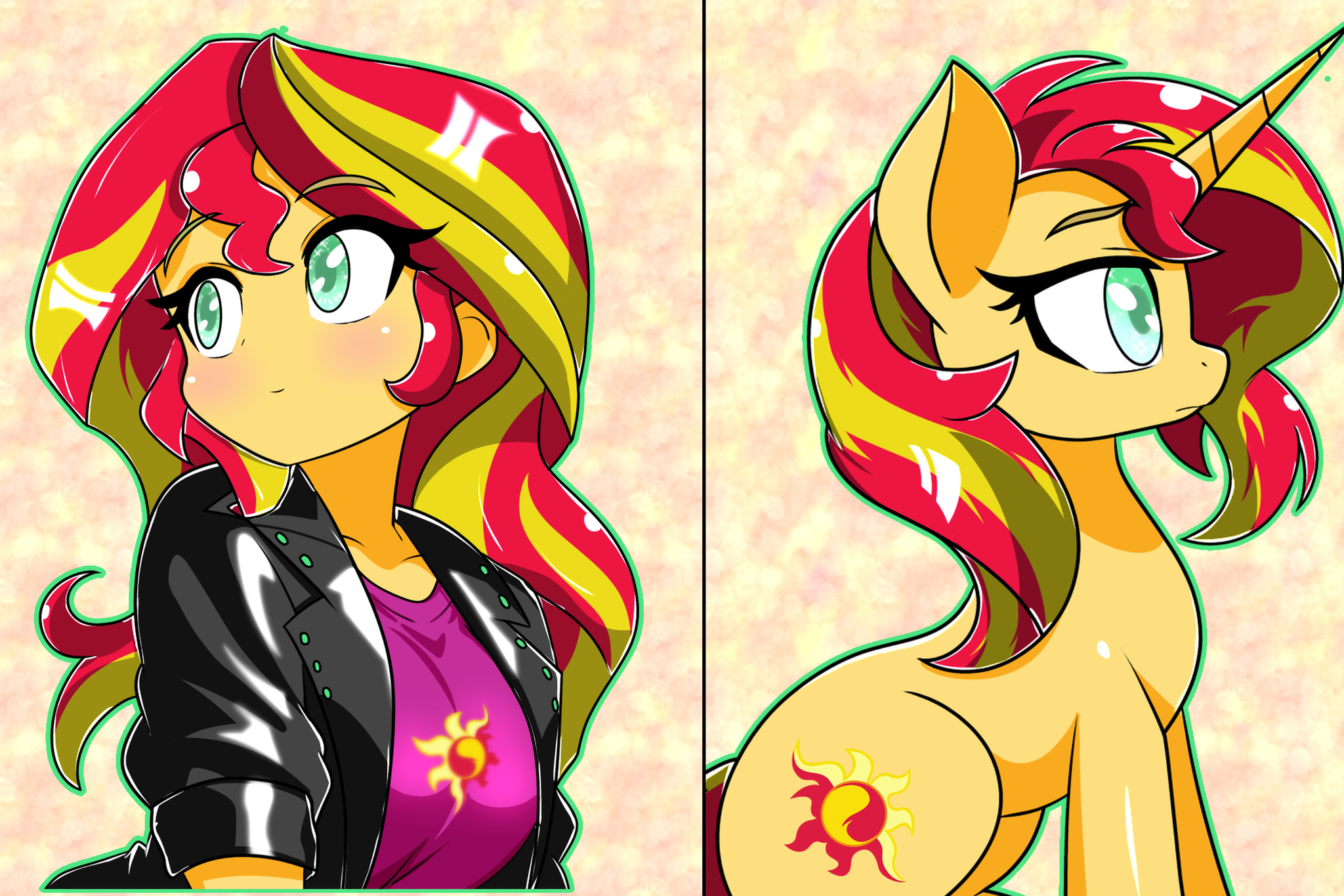 Сансет Шиммер, пони и членавек. Когда-то была ученицей самой принцессы Селестии и подавала большие надежды, но испортилась, стала жадной и алчной. Сбежала через портал в мир цветных обезьян, что бы найти силу и стать аликорном, но малость не срослось. Исправилась, получив Лучами Дружбы по роже, и встала на путь постижения дружбомагии. Хоть и не все поверили в её исправление, а некоторым было даже мало помощи в нагибании сирен, она прошла долгий путь от верховного хулигана до самой классной девочки школы. А ты бы хотел с ней дружить, Анон?