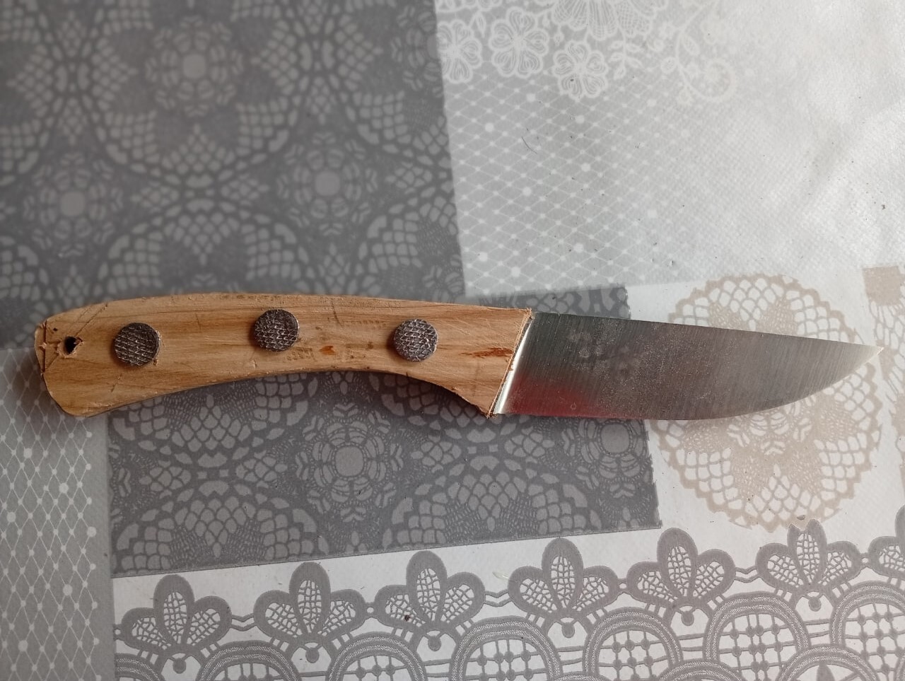 Вполне отдаю себе отчет, что и дерево не то, и нестабилизированное, и может испортиться, потемнеть, отсыреть, лопнуть, пины-гвозди проржавеют, но сейчас это меня совершенно не беспокоит. Скоро схожу в лес по грибы с собственным ножом. Испортится - теперь знаю как починить.