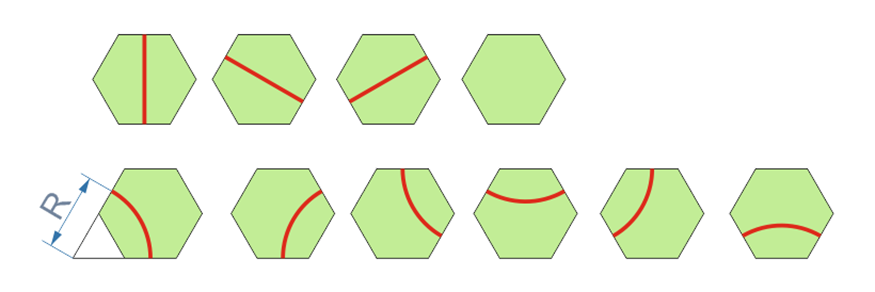 Ну хорошо, а какие могут быть варианты путей на этих плитках? Нужно ехать прямо и все прямые куски одинаковые? Сделано. Нужно поворачивать и тоже одинаковыми кусочками? Окей. Плюс поворачивать составом желательно как и на взрослой дороге – с максимальным радиусом. Т.е при создании поворота соединяем нижнюю сторону и какую-нибудь из несоседних, вот так. (С минимальным радиусом «к соседней стороне» поворачивать я не буду т.к. слишком мал радиус.) И оказывается на шестиугольнике такой центр поворота лежит аж вне габаритов плитки. Шикарно! И плитка «поворот» так-же остается одна: поворот либо налево либо направо, достигается просто поворотом кусочка.