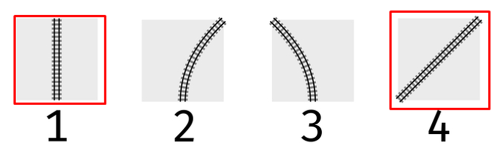 Дальше комбинаторика вариантов "парочками" с прямой и поворотом как товарищ в статье. Всего получается… пять уникальных вариантов. И всякие запрещенные – с двумя непересекающимися поворотами на одном тайле. Такой не пойдет скорее всего из-за габаритов паравозика, так что его… да просто не буду делать, как и товарищ выше на квадратных тайлах и все. Перекресток двух прямых туда-же, его просто не будет во избежание аварий. Есть еще вариант тройной стрелки на одном тайле, но на взрослых дорогах его стараются избегать, так что и я его тоже откидываю. И не стоит делать две стрелки на одном тайле чтоб не путаться с адресацией. И три стрелки тоже не будем. Один таил=одна стрелка.