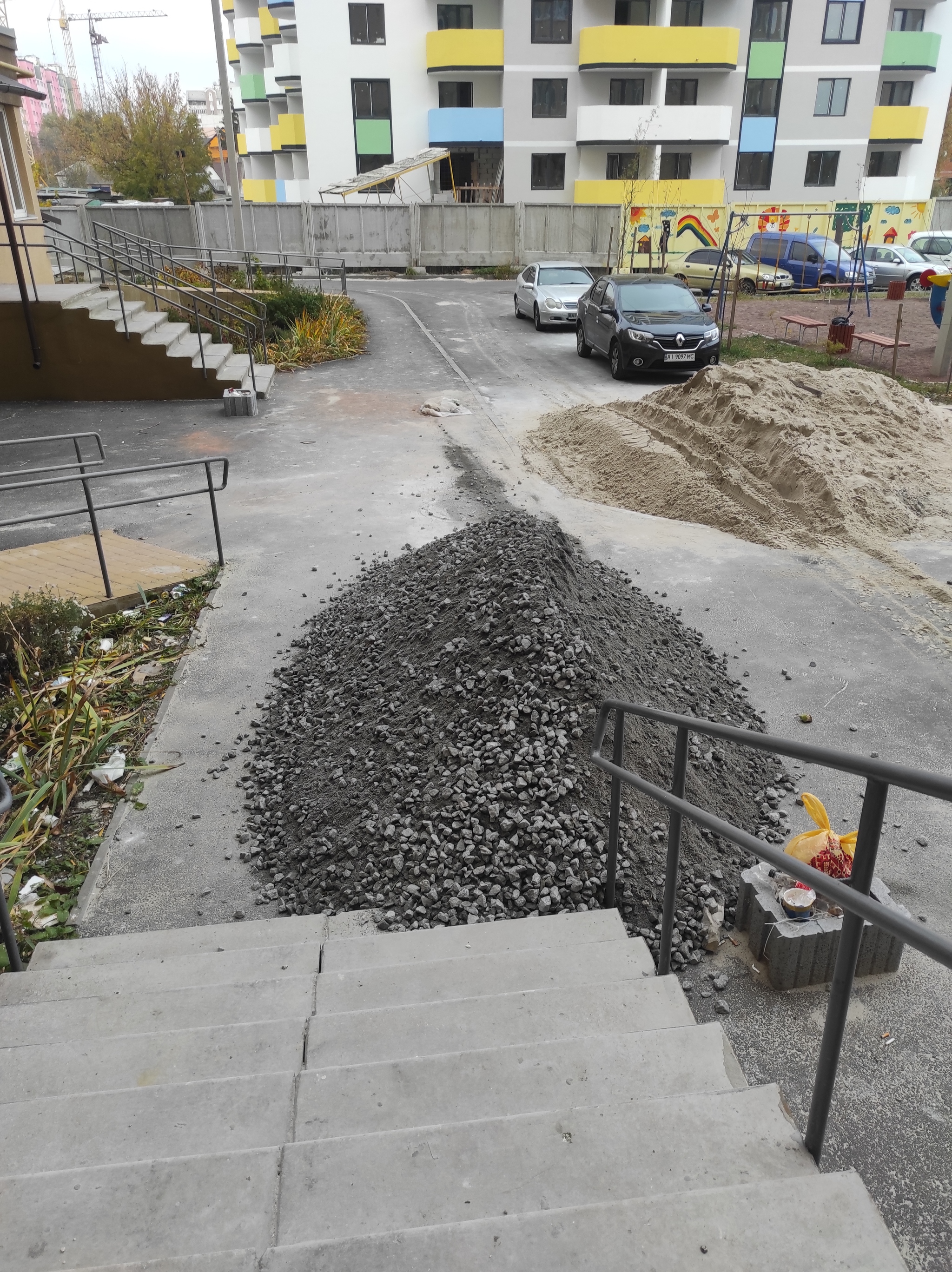 Украина. Живу в новостройке. Куча с песком лежит уже больше недели. Сегодня на входе в подъезд навалили щебень. Есть ли рычаги закона, на которые можно нажать?