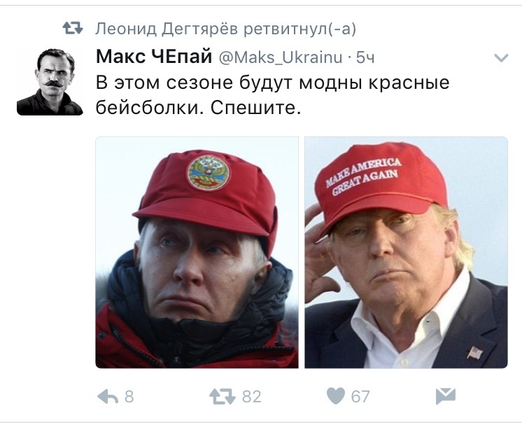 16 DELETED Политика Законодатели высокой моды 8 лет назад https://twitter.com/maks_ukrainu/status/847743848994361346 Владимир Путин Дональд Трамп Кепка X (Twitter) Мода Скриншот