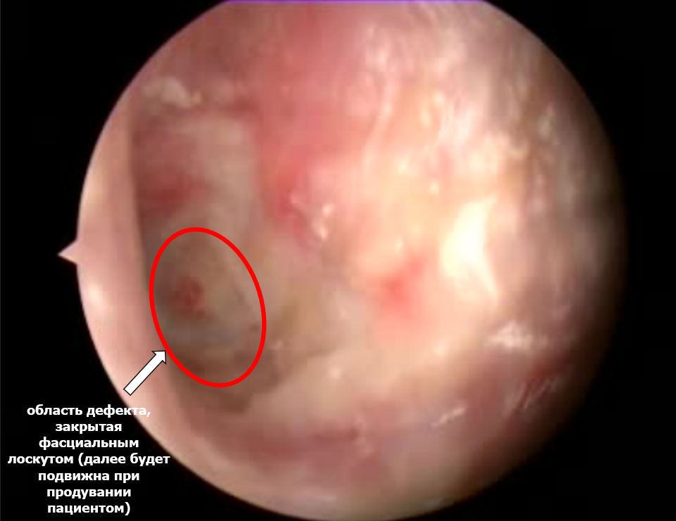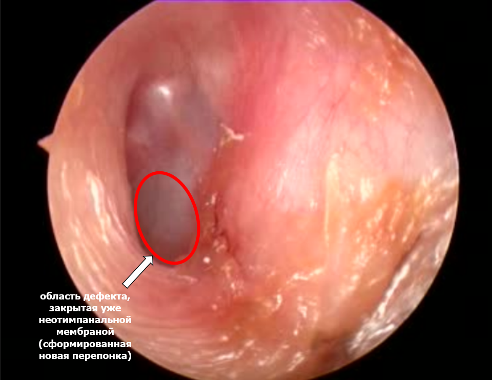 У представленного пациента дефект возник на фоне перенесенного острого гнойного среднего отита, который, к сожалению, в течение 3 лет не закрылся самостоятельно.