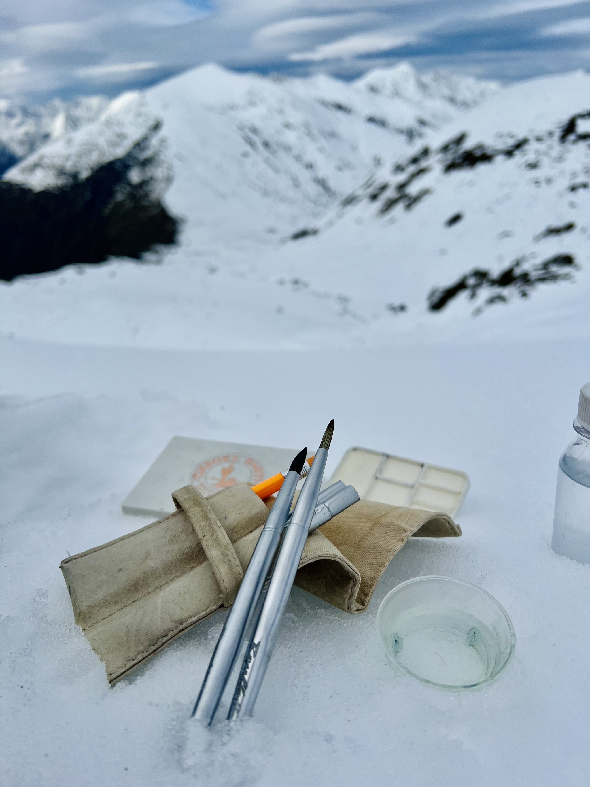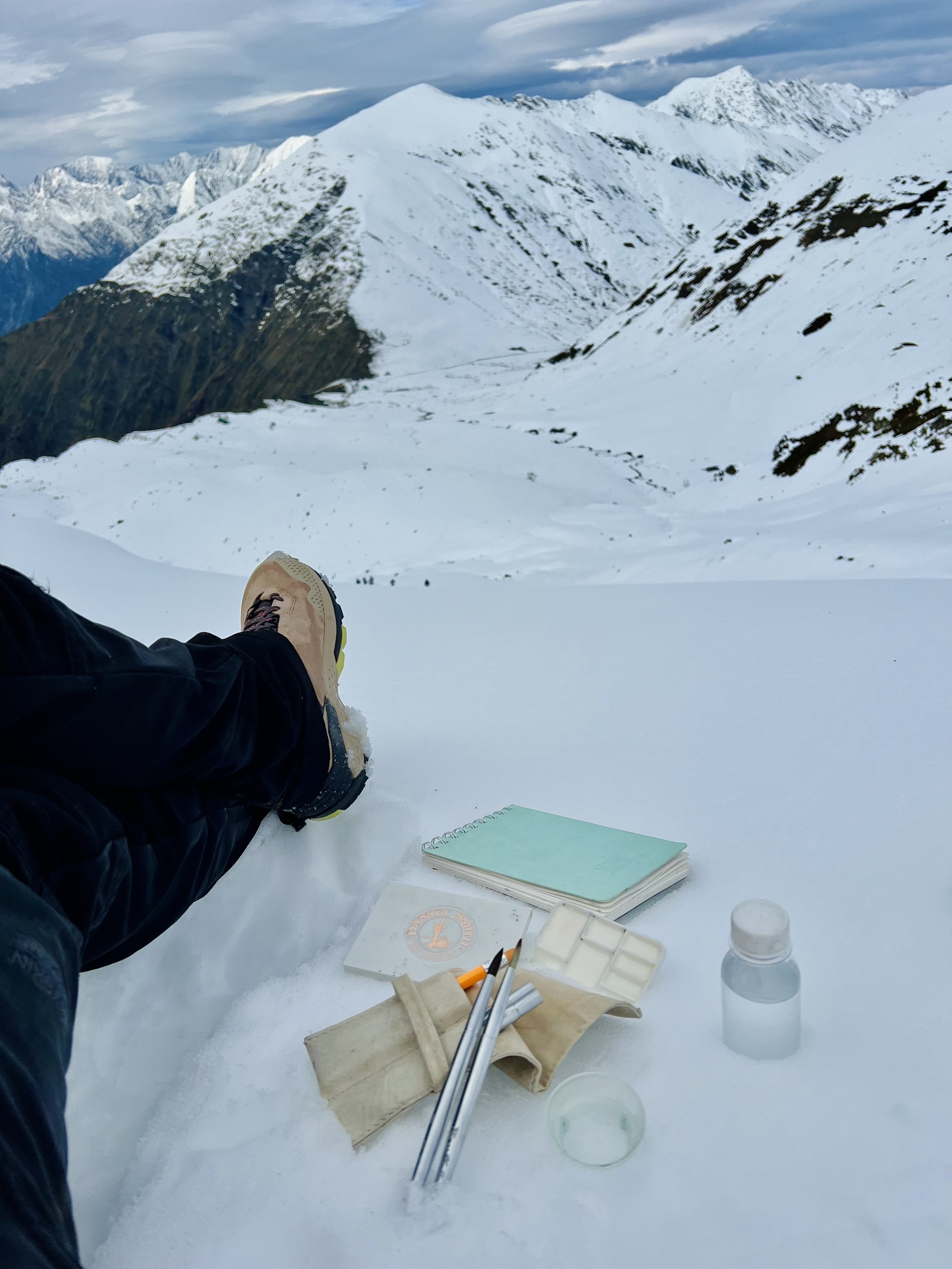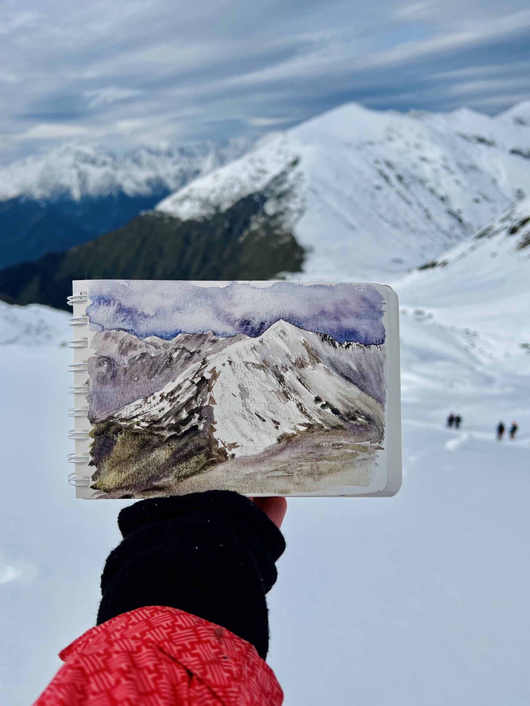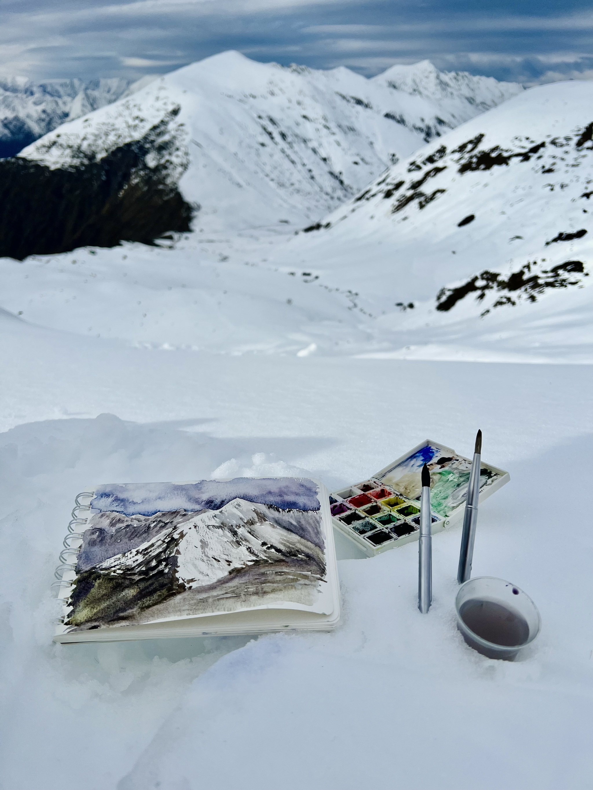 В горах плотно лег снег, так что сезон летних походов сегодня был закрыт. Рисовать в снегу было прикольно, очень быстро сохла акварель, а может замерзала? Но мне понравилось