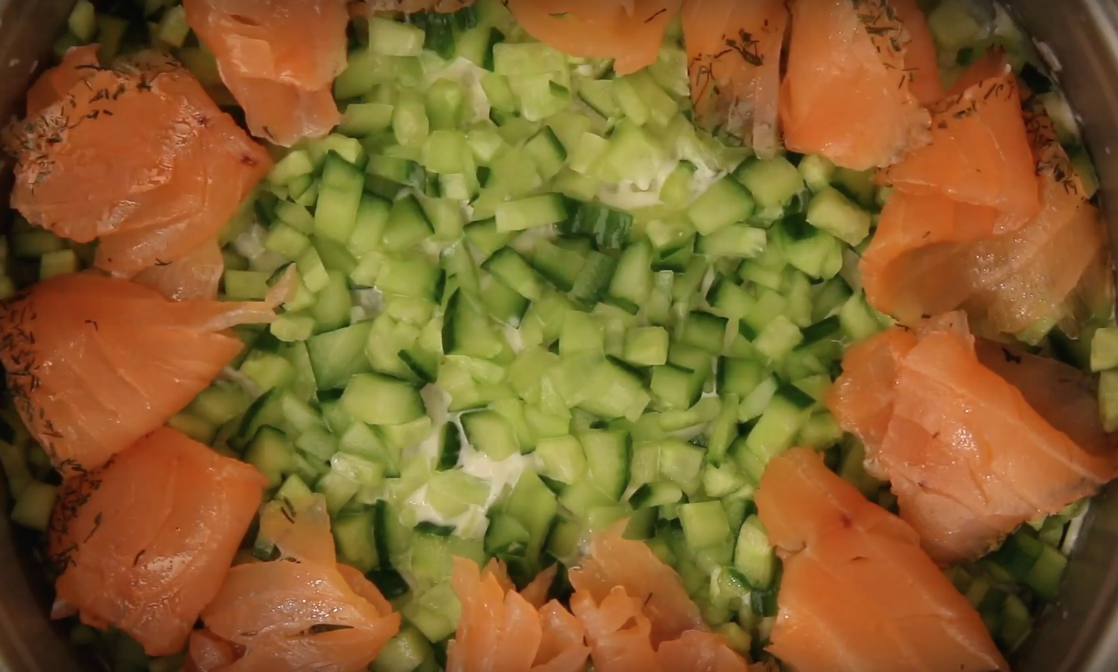 Далее слой лосося и посыпаем оставшейся зеленью.