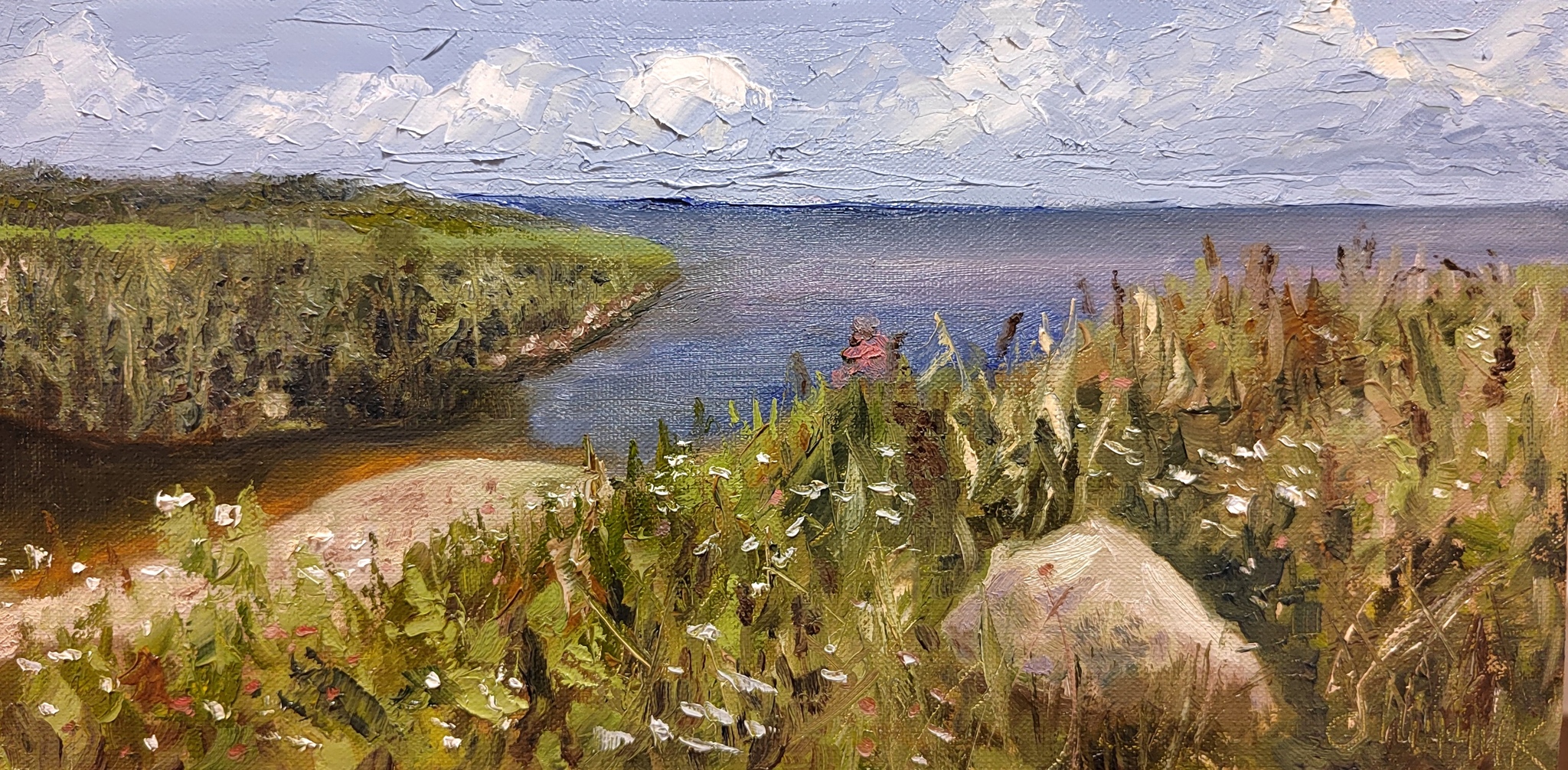 Там за ковылем тетечка в розовом. У нее шикарная грудь. А так 20*40, холст, масло.