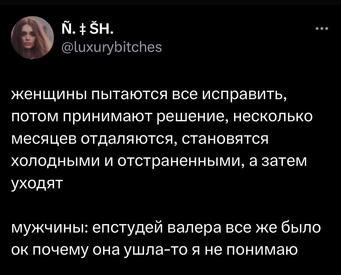 6 Irochka518 Замечали такое? 7 месяцев назад Грустный юмор Женщины Мужчины и женщины Скриншот X (Twitter) Проблемы в отношениях Расставание 1 Ещё 0