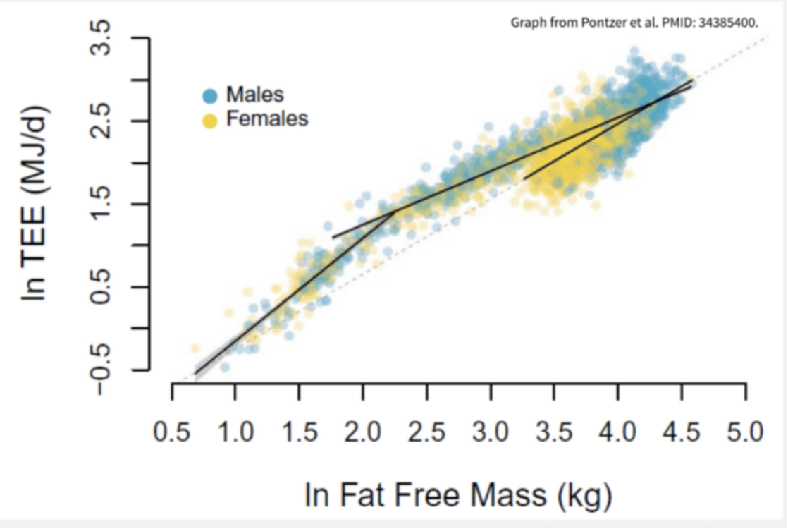 Перевод графика: Вертикальная шкала: In TEE (MJ/d) - (общий энергетический расход (ОЭО), МДж/сутки)); Males/Females (Мужчины/Женщины); Горизонтальная шкала: In Fat Free Mass (kg); В безжировой массе (кг); Фраза сверху: График из Pontzer et. al. 34385400