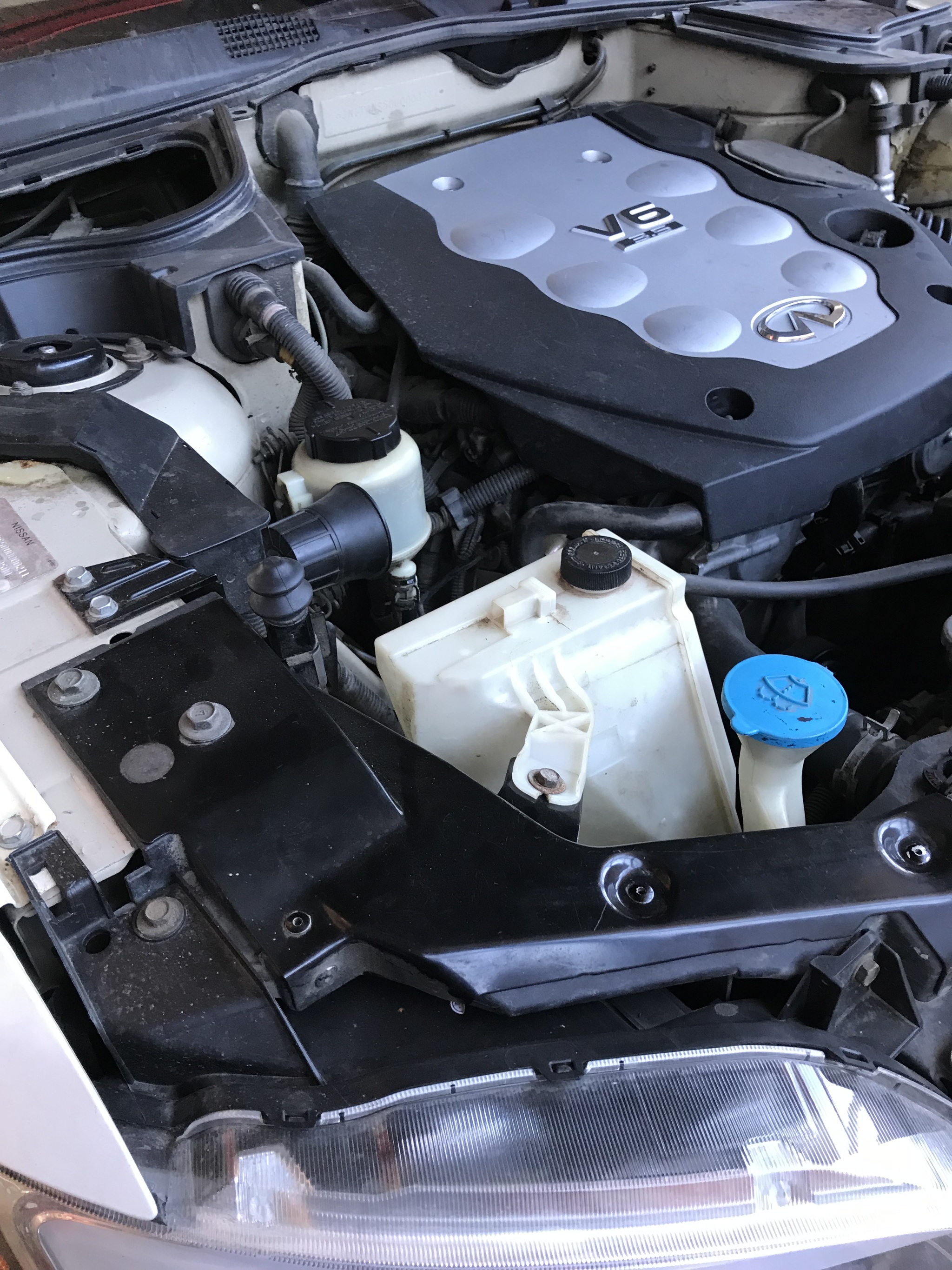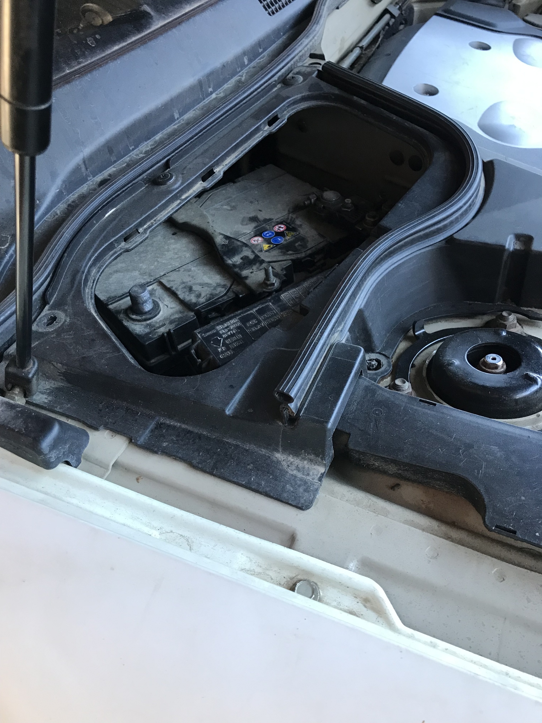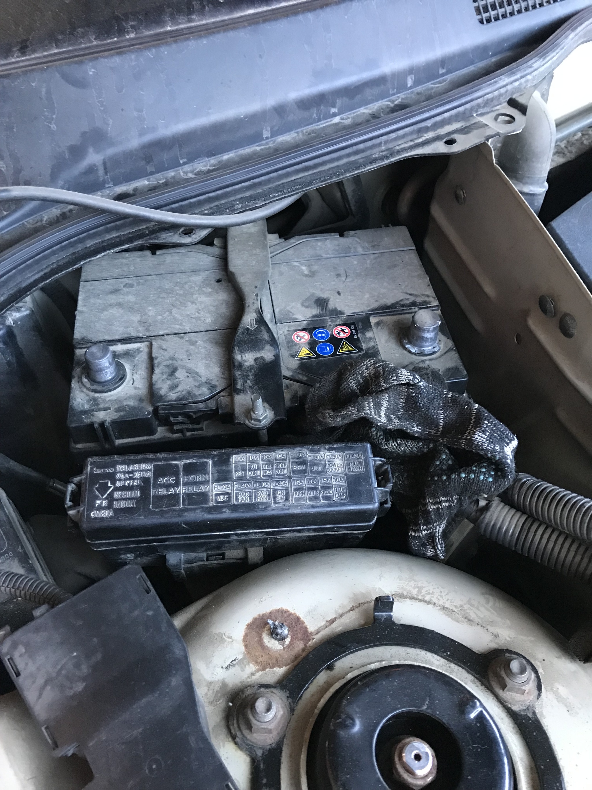 Освобождаем доступ к аккумулятору: снимаем пластиковую крышку, рамку и резиновый уплотнитель. Отключаем клеммы аккумулятора, на плюсовую клемму одеваем перчатку(может и не надо, но привычка). Откручиваем планку которой крепится аккумулятор, достаём обе шпильки. Не забываем снять к крепления маленький блок реле и предохранителей: нажимаем защёлку от себя и аккуратно приподнимаем блок вверх и отводим в сторону.