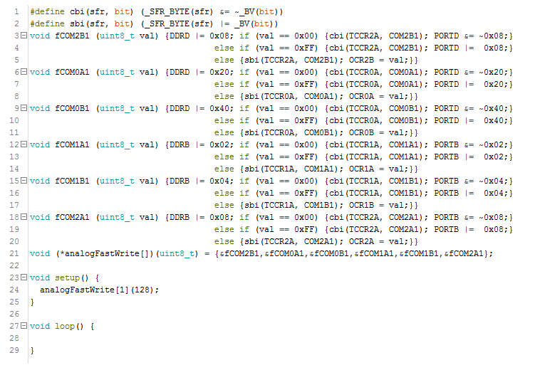 Есть 6 функций, каждая и которых отвечает за свой пин (3, 5, 6, 9, 10, 11), по порядку. Алгоритм функции таков: сначала порт переводится в режим OUTPUT, затем, если задаваемое значение скважности 0 или 255, то отключается режим ШИМ, и в порт пина записывается 0 или 1, иначе, включается ШИМ на нужное значение скважности. В общем и целом, вся логика сделана такая же как и у analogWrite, только без всех проверок и прочих определений, все только по факту.
