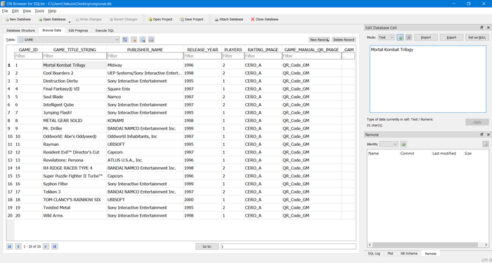 Теперь идем в папку /gaadata/databases/ и скачиваем на свой ПК файл regional.db - в нем содержатся описания игр для оболочки. Открываем файл в программе DB Browser и переходим на вкладку Browse Data.