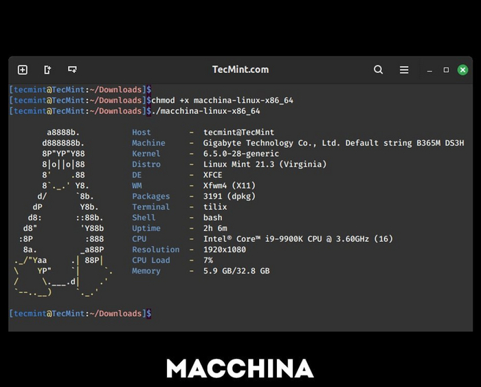 Чтобы установить macchina, загрузите соответствующие бинарные файлы для вашей системы, установите разрешение на выполнение и запустите ее, как показано ниже.