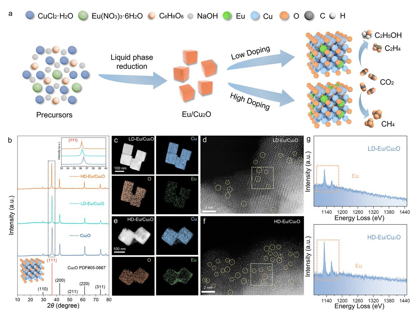В экспериментах исследователи интегрировали атомы европия в кристаллическую структуру оксида меди (Cu2O), формируя модифицированный катализатор Cu2O-Eu. Ключевым открытием стало то, что концентрация европия напрямую влияет на доминирующий продукт реакции. Когда концентрация Eu была низкой (например, менее 5% атомарного содержания в Cu2O), катализатор способствовал образованию продуктов C2+ с высокой эффективностью. Фарадеевская эффективность — метрика, измеряющая долю электрического тока, используемого для целевой реакции, — достигла почти 80% для C2+ продуктов. Это означает, что около 80% электроэнергии шло на создание ценных веществ, таких как этилен или ацетальдегид, вместо побочных реакций. Напротив, при более высокой концентрации Eu (скажем, свыше 10%) катализатор смещал реакцию в сторону продуктов C1, таких как метан (CH4), конечный газообразный продукт, полезный в качестве топлива.