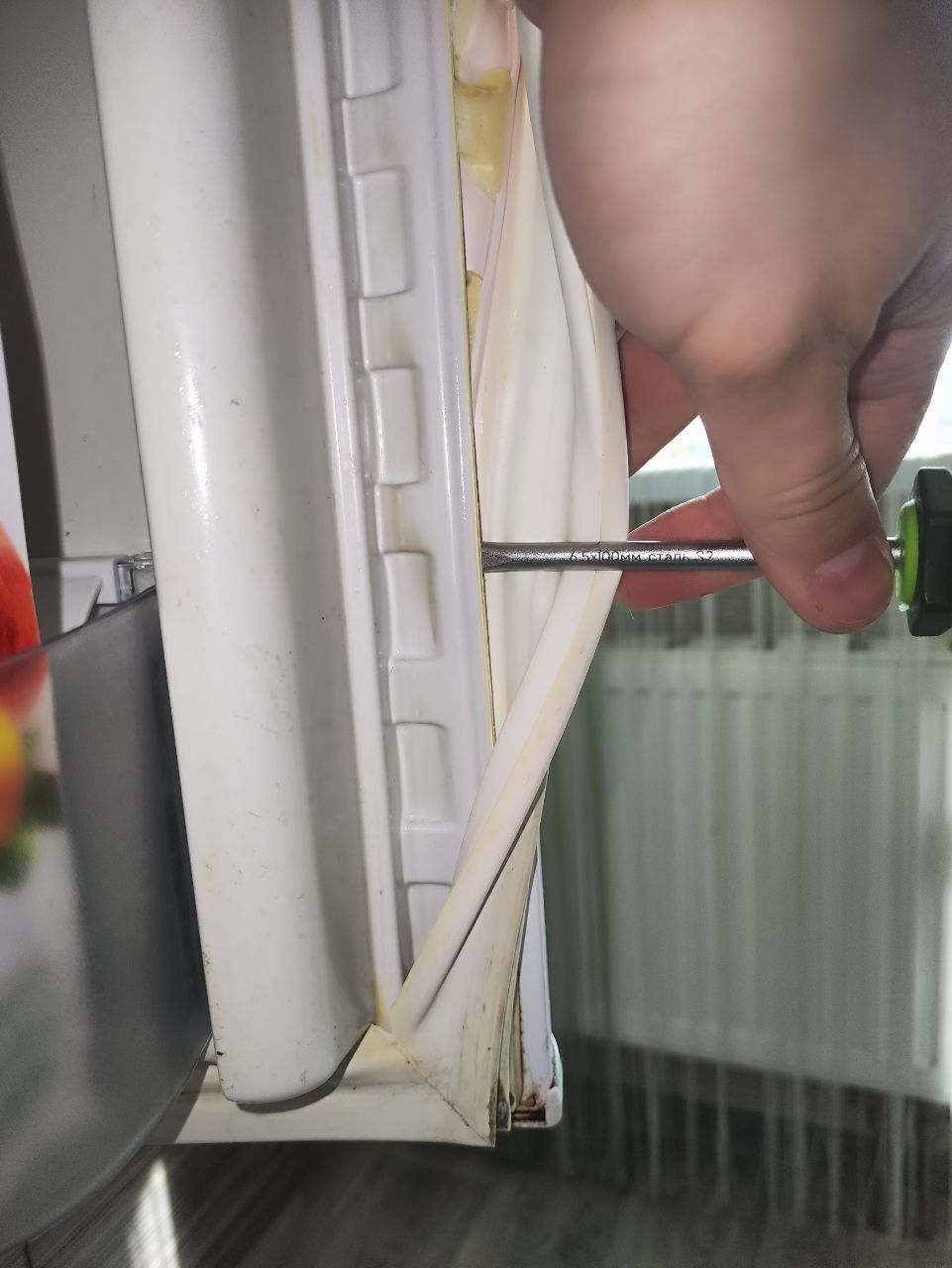 И так,размер у нас подходит,приступаем к демонтажу старых резинок. Я делаю это с помощью шлицевой отвёртки,также это удобно делать с помощью шпателя. Самое главное при демонтаже-полностью достать старую резинку,с корнем,иначе новая просто не залезет. Для этого необходимо пройтись отвёрткой по всему периметру дверцы,сначала между резинкой и металлической части дверцы