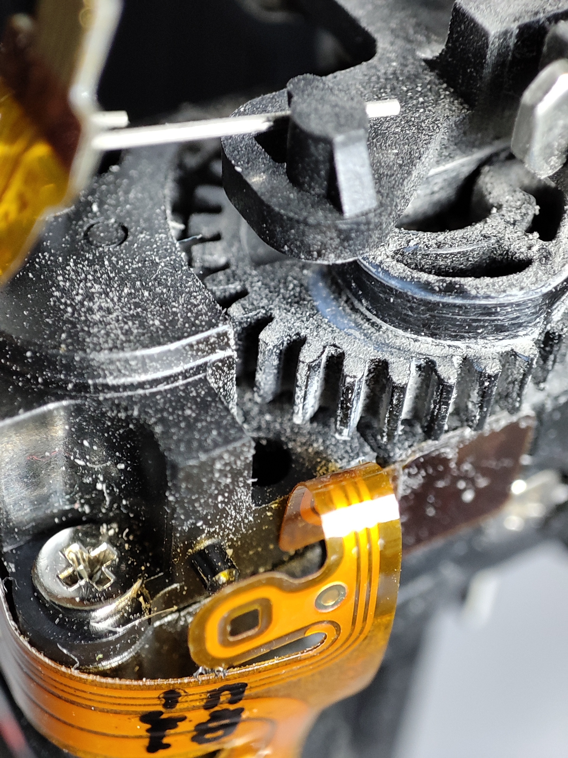При детальном рассмотрении затвора можно увидеть на нем пыль от пластмассы. Внутри у него стерлась приводная шестерня которой от мотора двигается механика.