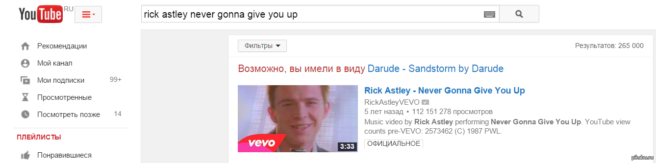 Instante Заметил что YouTube тоже подготовил маленький розыгрыш 10 лет назад При запросах ссылается на известный мем - Sandstorm 1 апреля YouTube Darude - Sandstorm Rick Astley
