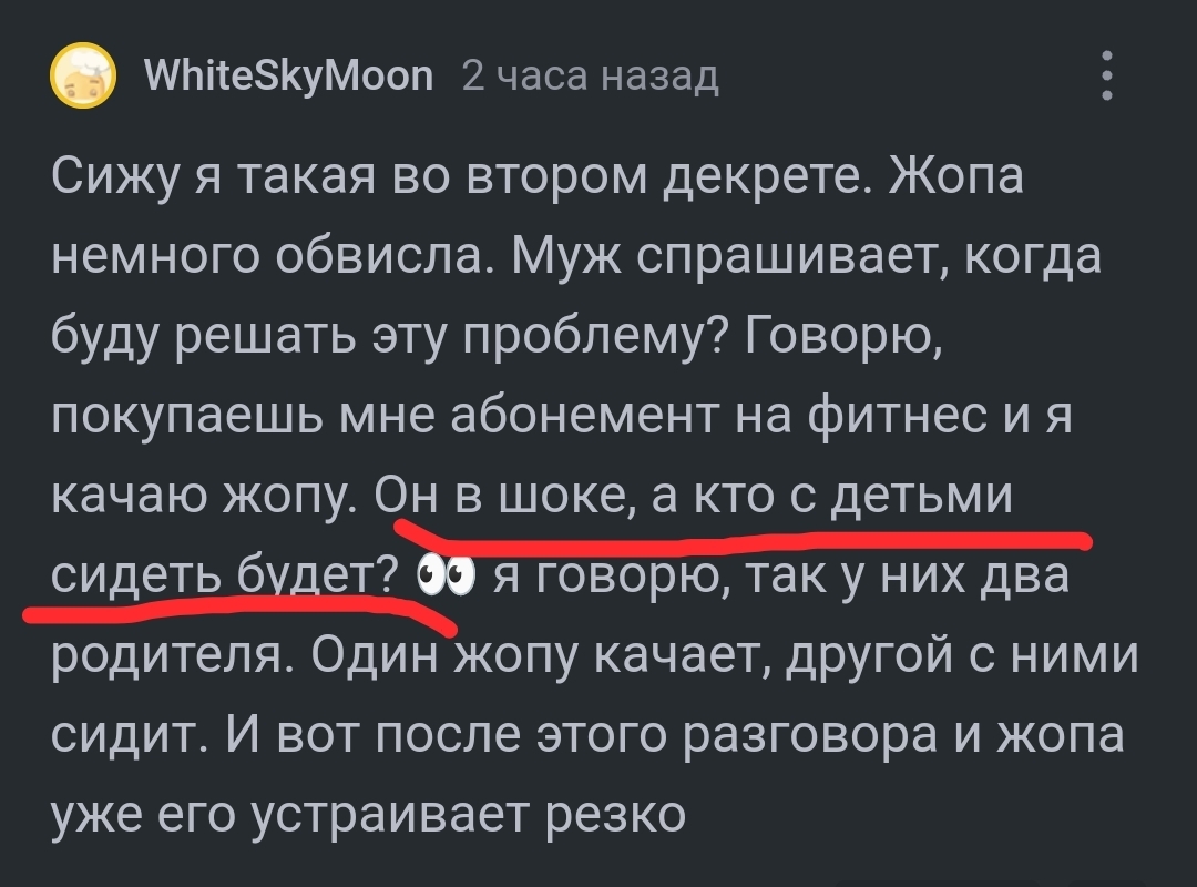 Сначала ты забиваешь на себя, живешь и пополняешь свою жировую массу, обижаешься на мужа что он не ценит тебя такой.. Потом Вы разводитесь. Ты понимаешь что надо искать место в этой жизни и конкурировать среди тысяч таких же как ты. Ты записываешься в спортзал и со скоростью света начинаешь делать свою фигуру! Ты молодец!