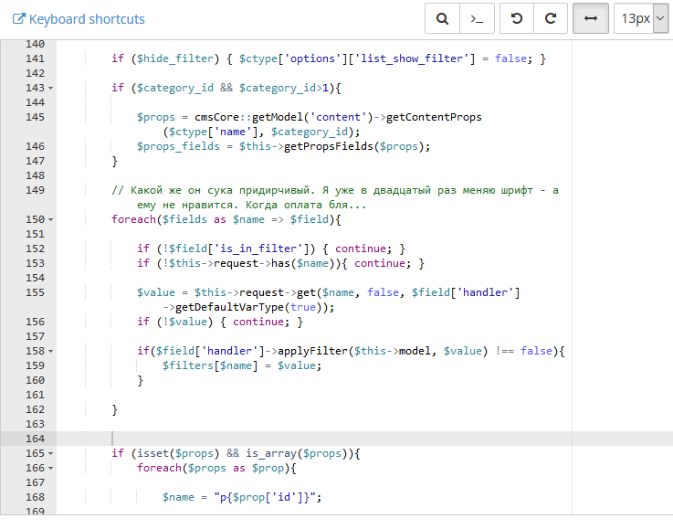 Обратился ко мне как-то дядька очень перспективный. С просьбой сделать сайт как у "ТАСС", только круче. Дядька, к слову, очень придирчивый оказался. Сайт я ему сделал за три дня, и еще две недели я менял всякие несущественные мелочи - иконка просмотров должна быть строго с отступом в 2 пикселя от блока, отображение блоков с новостями должно быть точно такое же как у сайта "ведомости". В-общем две недели с лишним я мудохался с этим сайтом, пока он мне не заявил что моя работа его не устраивает и он прекращает со мной всякие отношения. Моей ошибкой было то, что я разместил сайт на его хостинге. После этого заявления доступ к хостингу и сайту у меня естественно пропал. Никаких пасхалок я ему не успел оставить, кроме одной. Даже не пасхалки а послания будущим программистам. Есть у меня тупая привычка - комментировать код аля "микроблог". В каком-то из файлов движка я написал примерно следующее: