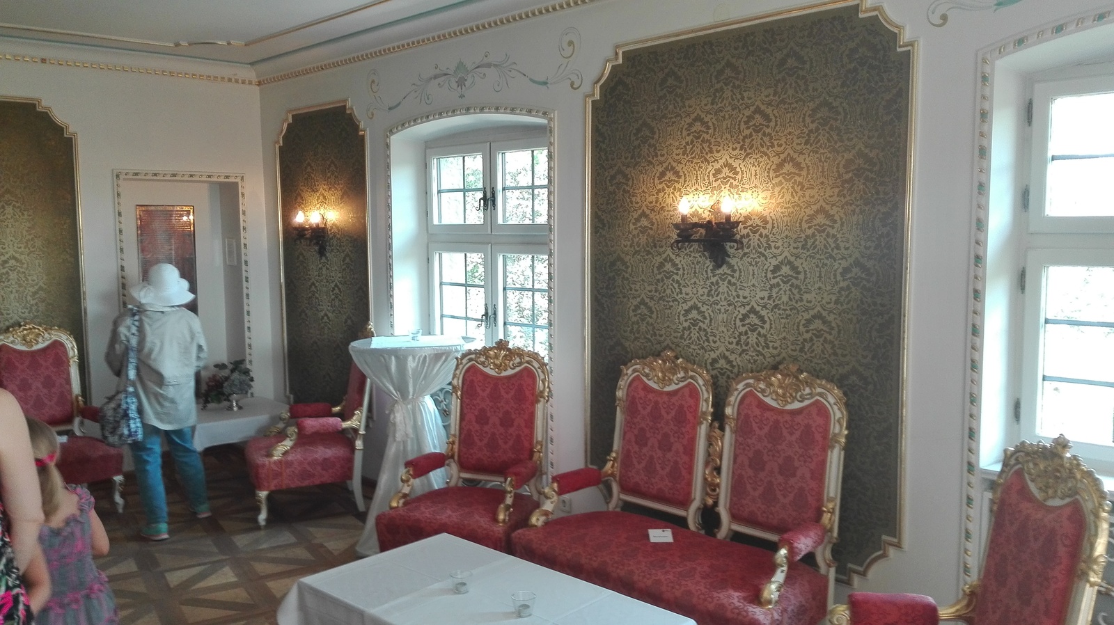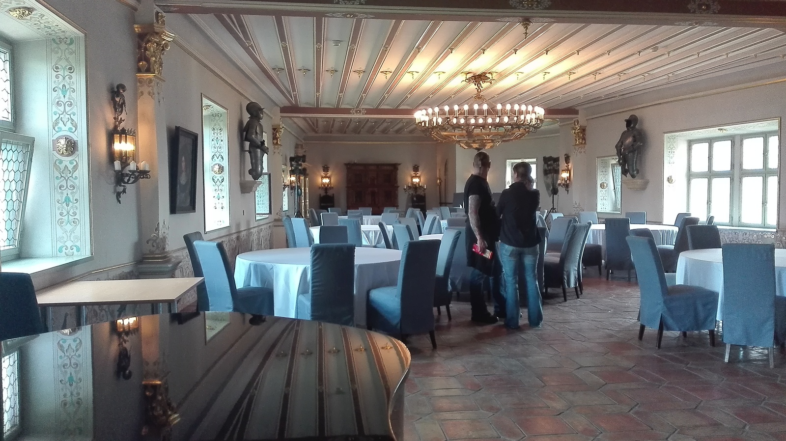 Потом салонный зал. Тут балы раньше собирались и вообще всякие торжественные события, впрочем как и сейчас. Свадьбу в этом замке отпраздновать дело хорошее и наверняка дорогое, но прецеденты были. Один из столов сервирован как пример обслуживания.