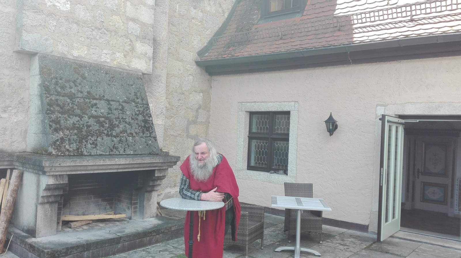 За вход мы заплатили 13 Евро. Билеты продавал мужичок в забавных одеяниях, он же и проводит получасовую экскурсию, рассказывая в лицах и на сильно баварском языке историю замка Рабенштайн.