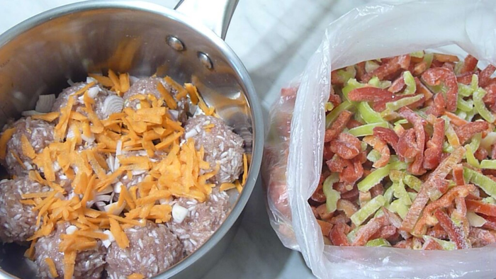 Но если морозилка не позволяет, то лучше конечно замораживать нарезанный перец. Так можно заморозить больше овощей, а заморозка получится более компактный и займет меньше места. Зимой же можно готовить ёжики и добавлять к ним в заправку больше нарезанного перчика. Вкус и аромат перцев готовому блюду будет обеспечен!