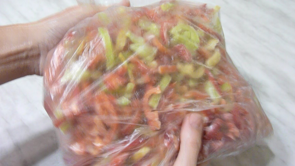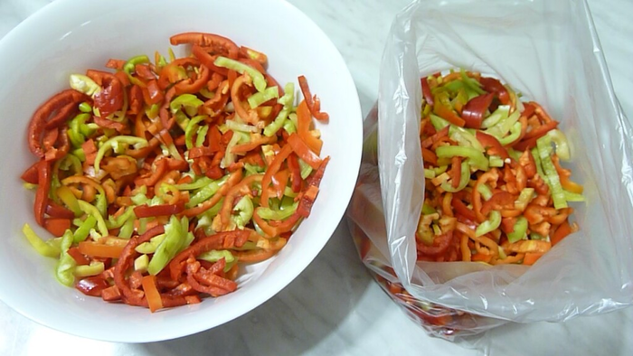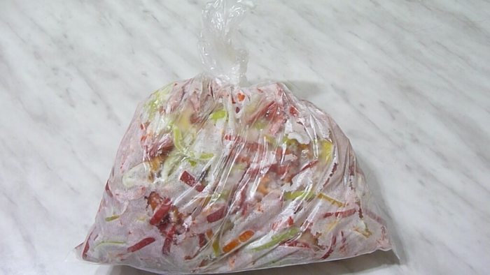 Но это легко исправить. Достаточно с усилием надавить на пакет с замороженными перцами и кусочки перцев быстро рассыпаются. Становятся разрозненными.