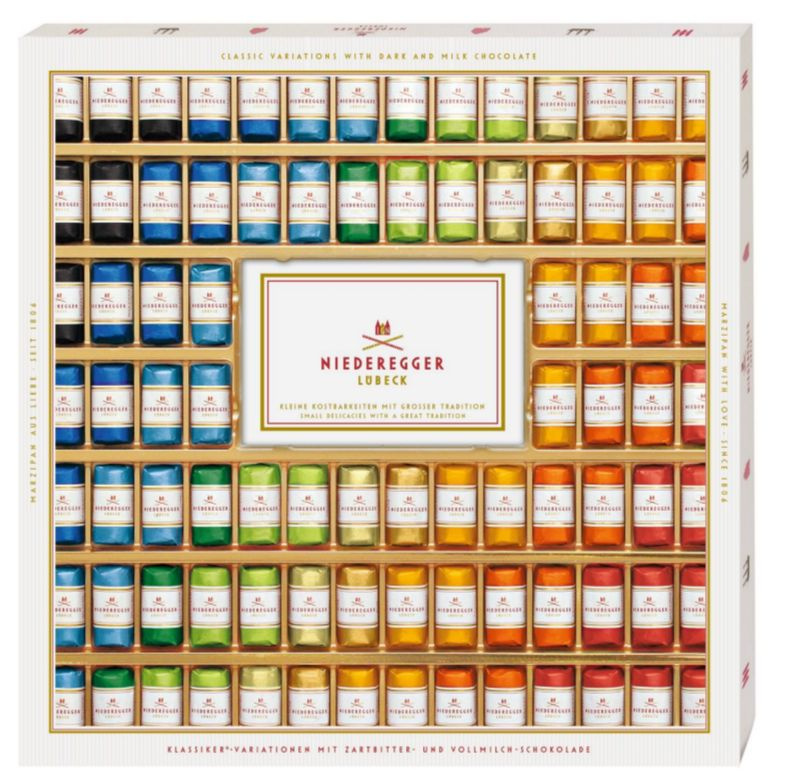 И стоит эта фигня дорого. У нас раньше продавались такие в виде фруктов - но это было на вкус кал, отдает уксусом и не имеет по сути ничего общего с марципанками. Может, сейчас кто-то лучше стал делать, но я в основном встречала конфеты немецкого производства. А еще я была непосредственно в Любеке, на фабрике этого самого Нидереггера и конечно же купила там оригинальные наборчики с разными вкусами. И быстро их сожрала.