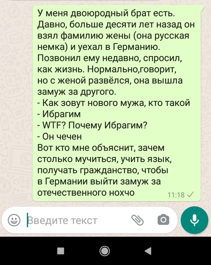 79 Oblomingo88 Юмор Замуж в Германии 5 лет назад Юмор Эмиграция Иммигранты Брак (супружество) Семья Германия Развод Чеченцы Скриншот Переписка 1 Ещё 0