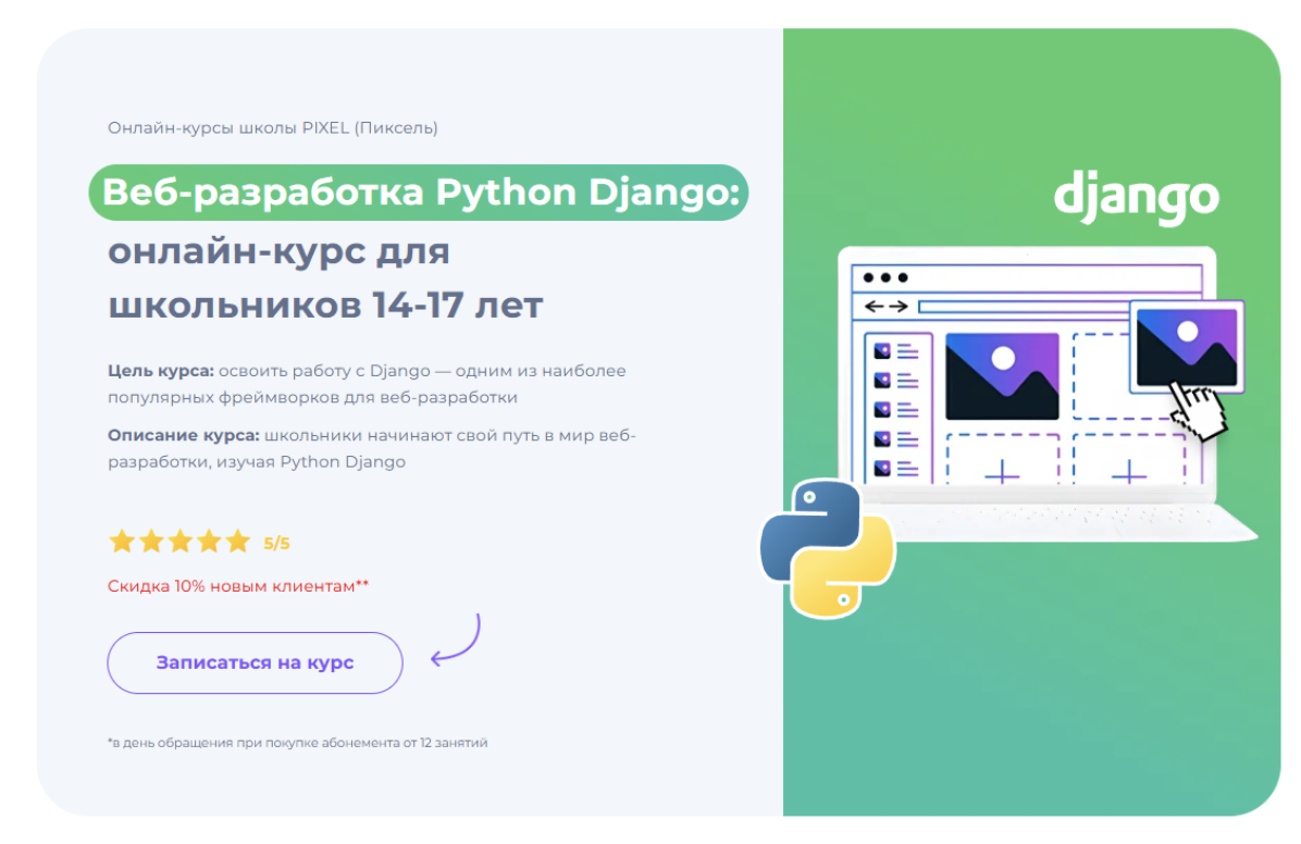 Здесь стоит отталкиваться в первую очередь и кроме всего остального от того, каков фактический уровень подготовки школьника. Если 7-классник уже успел познакомиться с азами в результате самообучения или прохождения тематических блоков теории и практики в рамках курса информатики, можно задуматься о выборе уроков с углубленным содержанием, как, скажем, в случае с веб-разработкой с применением фреймворка Django.