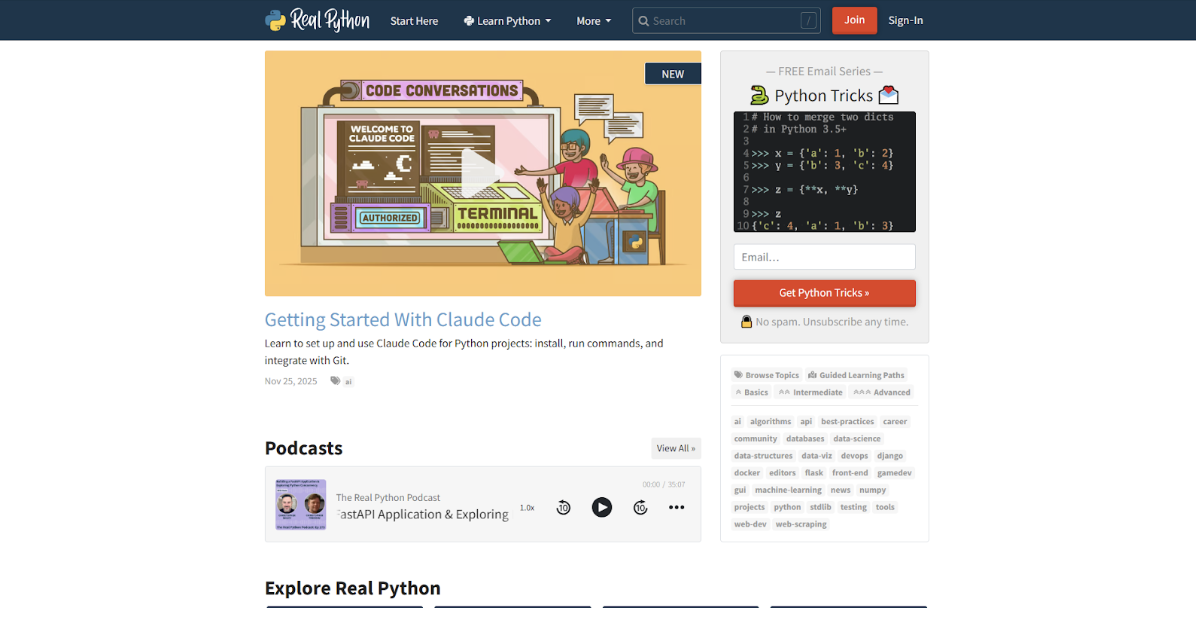 Рекомендуем и Realpython.com. Здесь можно найти обучающие, справочные и иные материалы. Речь о текстовых инструкциях, видеокурсах, учебных маршрутах, заданиях и т. д.