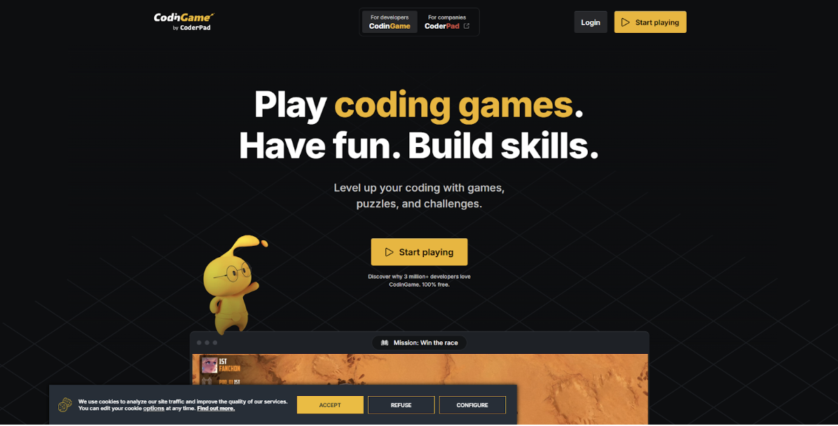 CodinGame.com. Отличительная особенность – поддержка 20+ языков программирования, «Питон» не является исключением. Платформа характеризуется обилием игровых режимов: можно участвовать в головоломках, многопользовательских квестах и т. д. Плюс – регулярное проведение соревнований по кодингу, за победу в которых можно получать ценные призы;