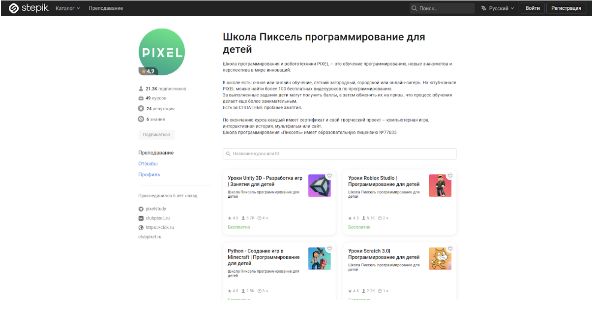В первую очередь рекомендуем страницу школы программирования Pixel на Stepik. Дело в том, что здесь удастся найти видеокурсы Python для детей и бесплатно освоить их.