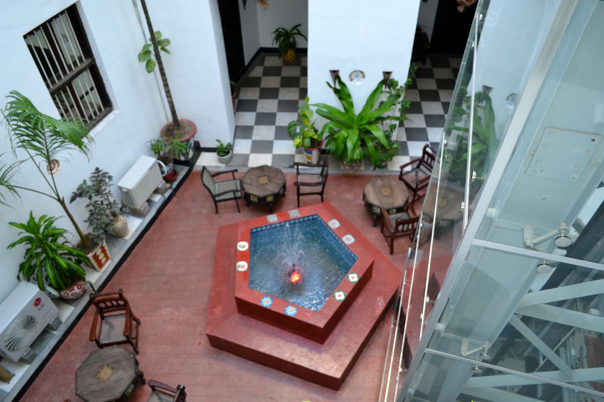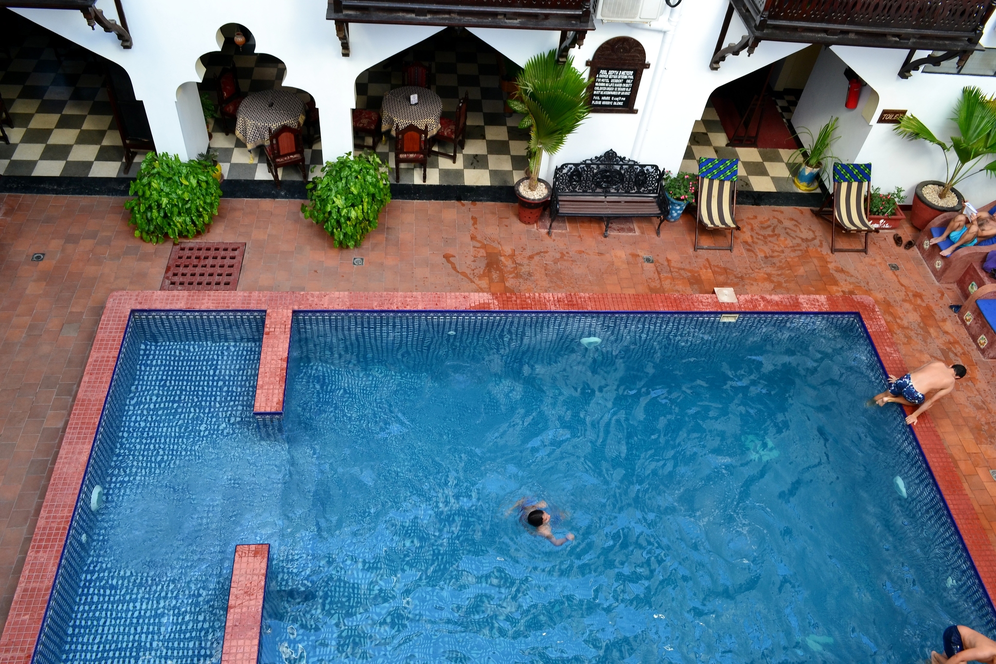 Окна и балкончики выходят во внутренний дворик с зоной отдыха и бассейном с прохладной водой, которая днем не нагревается