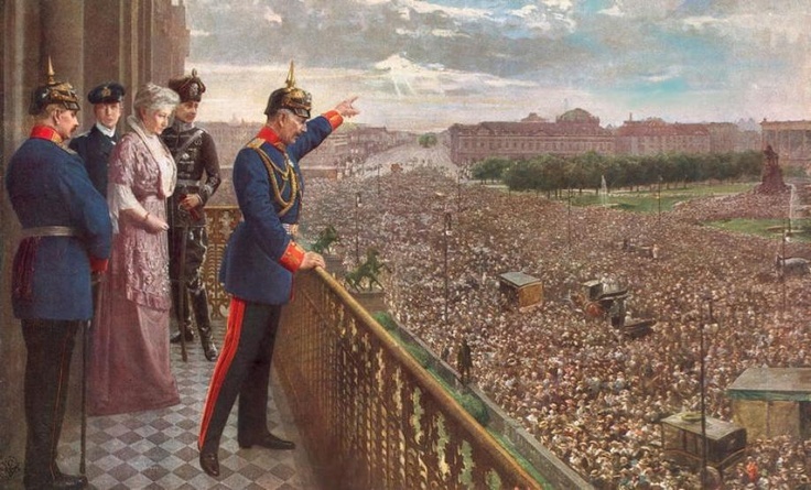 С началом Первой мировой войны 28 июля 1914 года европейские города охватил патриотический ажиотаж. На улицах Парижа, Петербурга и Лондона проходили манифестации, на которых люди пели гимн и выкрикивали лозунги во славу отечества. В Петербурге вся площадь перед Зимним дворцом была заполнена людьми с иконами, флагами и портретами Николая II. Когда на балкон вышел сам император, люди попадали на колени и устремили на него свои взоры. По замечанию Мориса Палеолога, французского посла в России, ставшего очевидцем этого зрелища, "тысячам коленопреклоненных людей Николай II, без всякого сомнения, казался олицетворением Бога, военным, политическим и религиозным наставником, властителем душ и тел". Похожую картину можно было наблюдать и в Берлине, где главным действующим лицом выступал кайзер Германской империи Вильгельм II, который, будучи облаченным в армейскую полевую форму, стоя на балконе своей резиденции перед возбужденной толпой, произнёс речь следующего содержания: "Для Германии настал грозный час испытаний. Окружающие нас враги заставляют нас защищаться. Да не притупится меч возмездия в наших руках. А теперь я призываю вас пойти в церковь, преклонить колени перед Богом справедливым и всемогущим и помолиться за победу нашей доблестной армии."