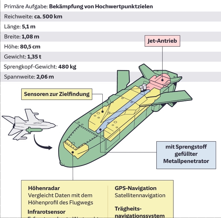 Обладая двухступенчатой боеголовкой, Таurus может уничтожать даже укрытые объекты: первая ступень, кумулятивный заряд, пробивает дыру.