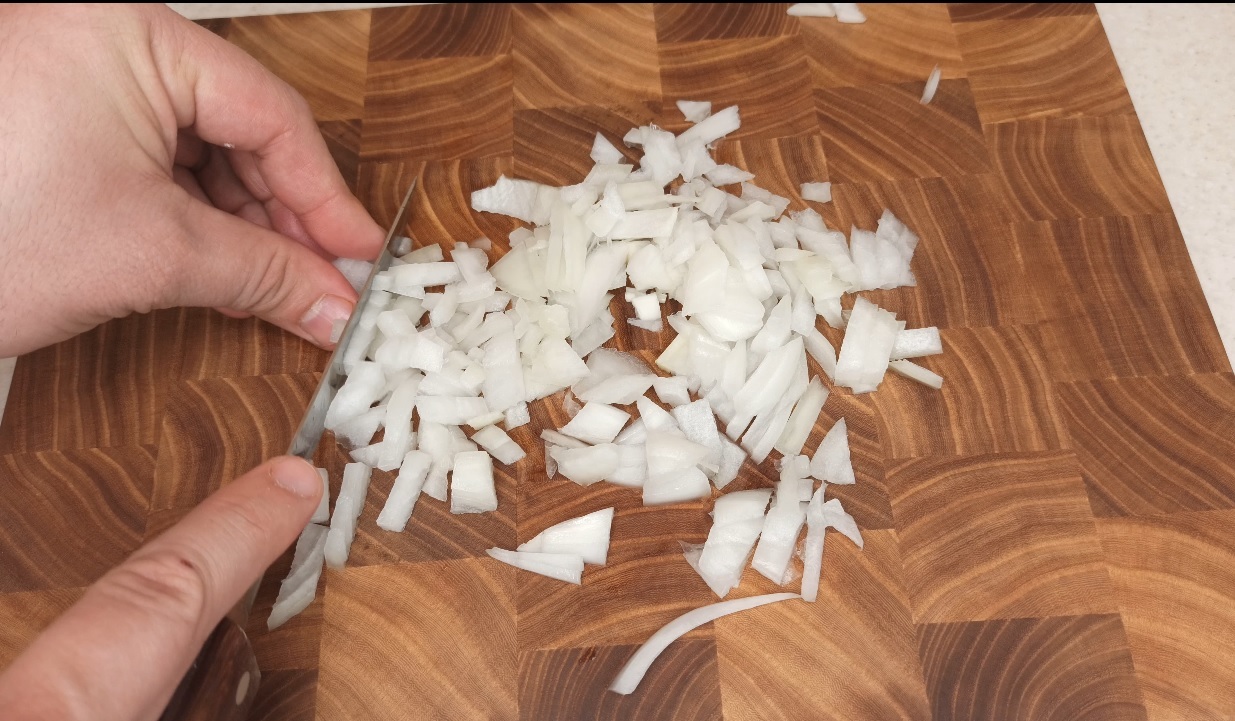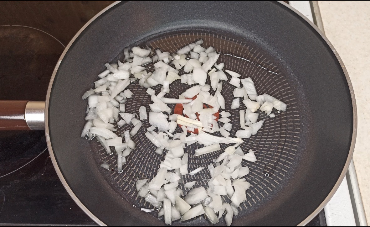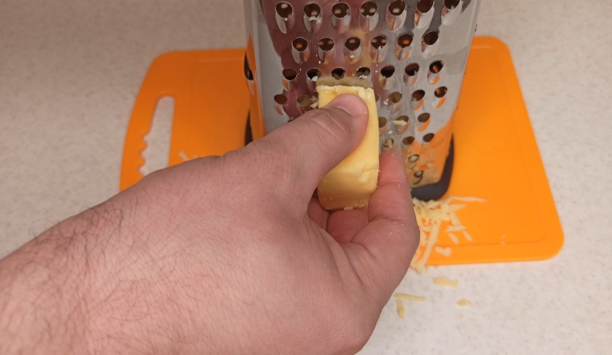 А теперь готовим начинку, натираем сыр на тёрке, режем мелко лук и отправляем его на сковороду.