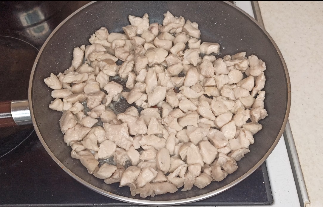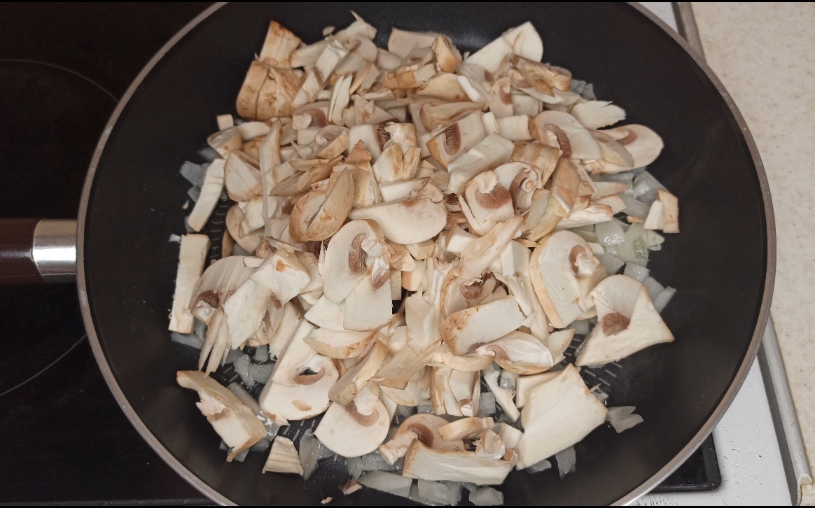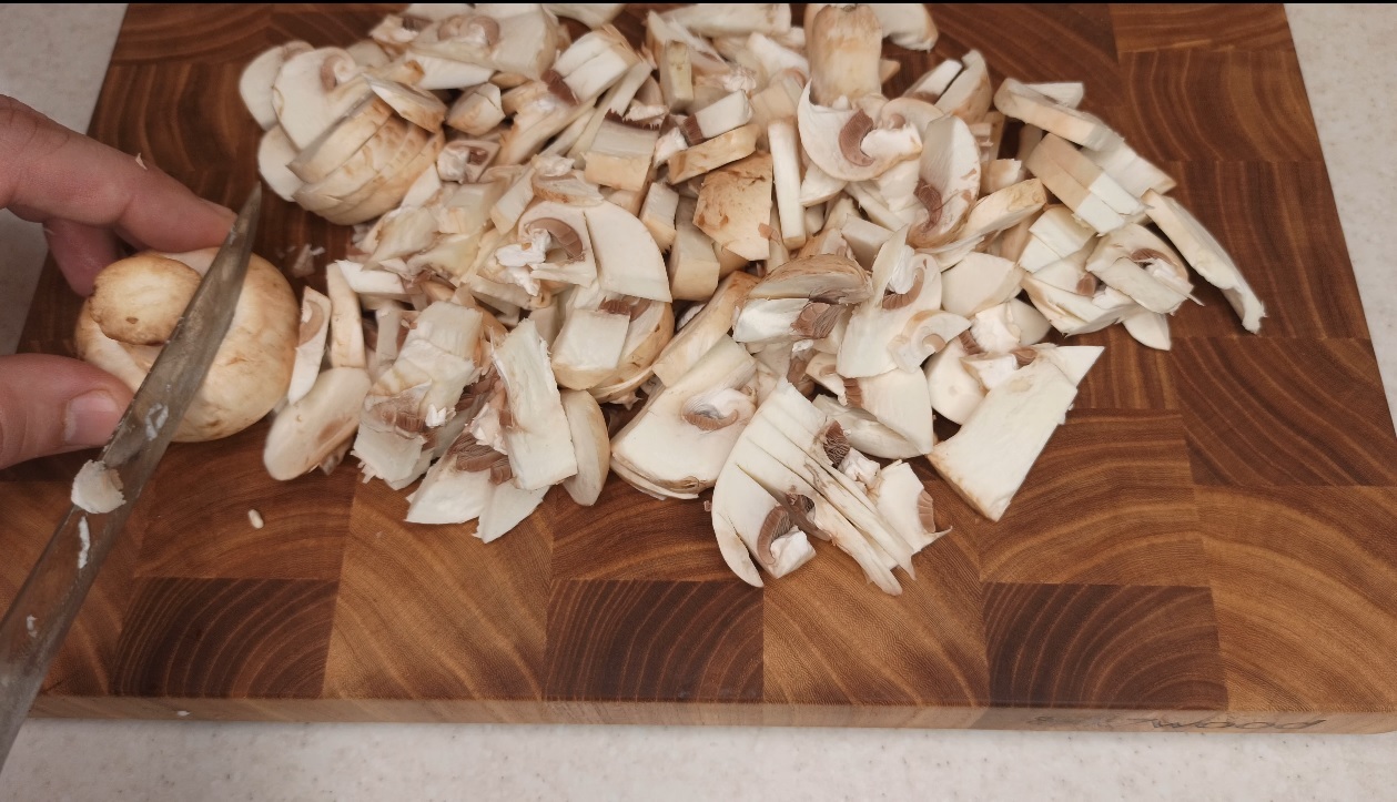 Теперь мы нарезаем грибы, у меня были шампиньоны. И отправляем к нашему луку.
