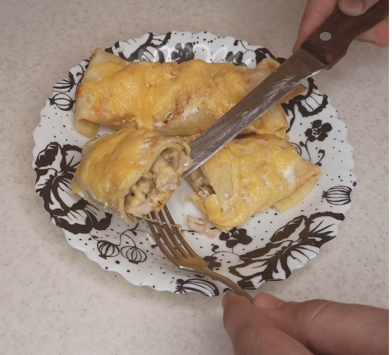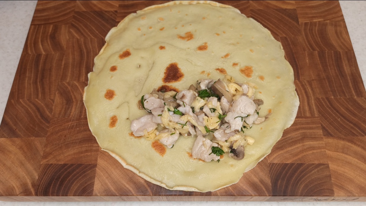 Теперь берем блинчик и выкладываем начинку на него с краю.
