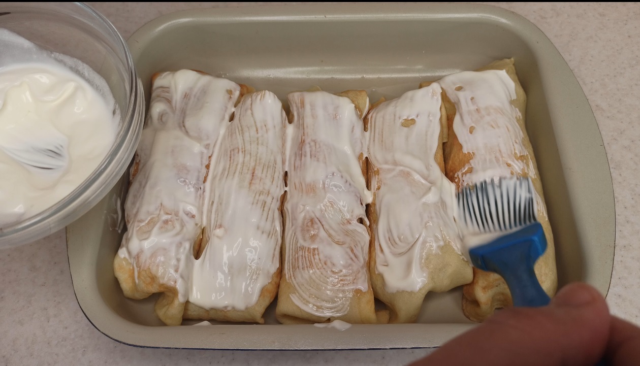 Эти рулетики мы отправляем в противень и смазываем хорошо сметаной. После чего накидываем сверху сыр тертый.