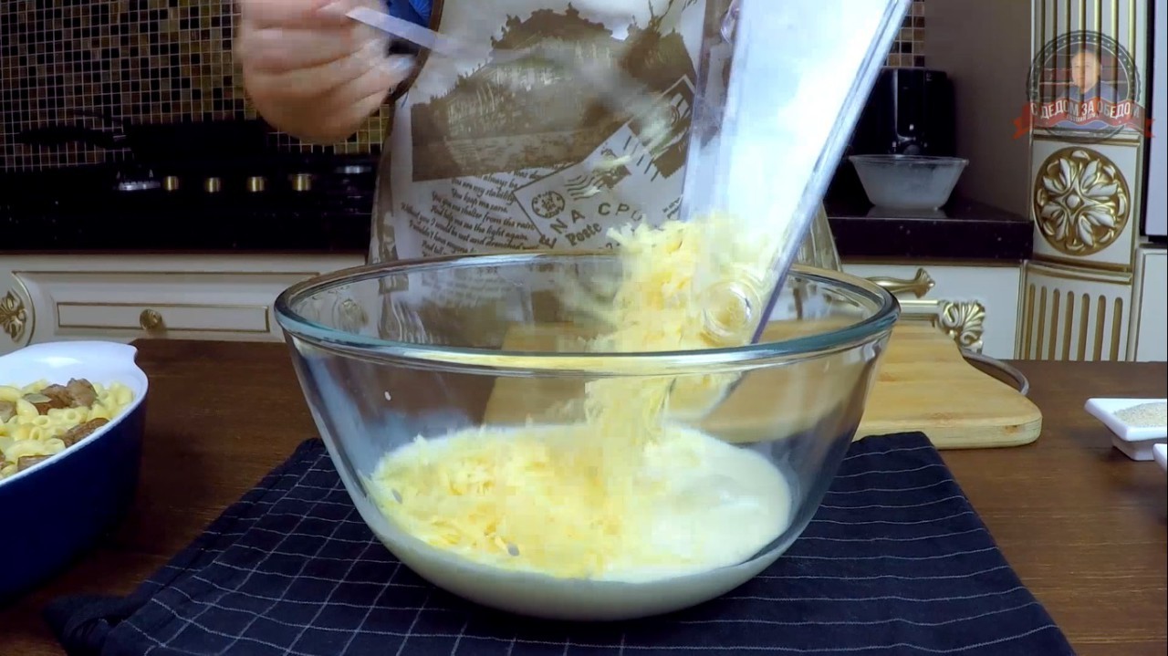 Делаем заливку: Сыр берите любой.Натереть его на крупной терке. Чеснок пропустить через пресс или так же натереть на терке. Яйца разбить в чашу и размешать вилкой или венчиком. Молоко или сливки ( у меня сливки 10% жирности) добавить в яйца. Добавить тертый сыр и чеснок. Затем соль, перец по вкусу. Все хорошо перемешать. Полить заливкой макароны с грибами. Разровнять сыр. Сверху присыпать панировочными сухарями по желанию. Я присыпаю. Мне нравится после запекания как образовывается румяная корочка сверху. Отправить запеканку в духовку, разогретую до 200 градусов на 20 минут.