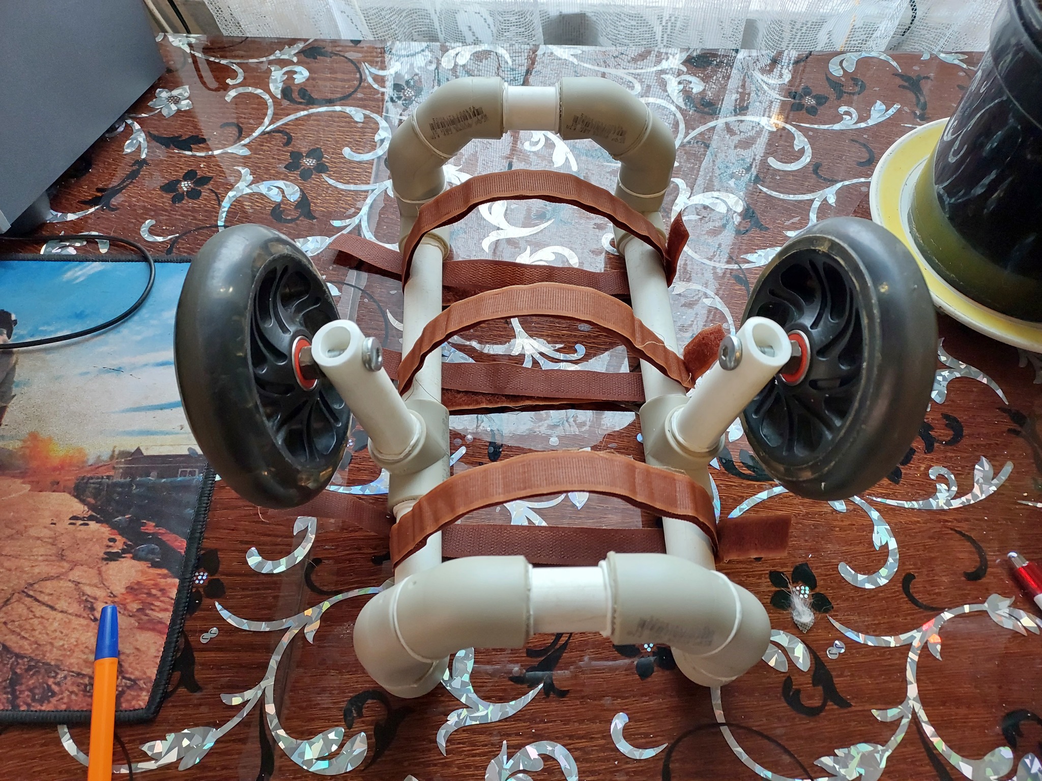 Что имеем: Котёнок со сломанным позвоночником в одном экземпляре, колёсики от детского самоката, трубы и уголки ППР, застёжки-липучки.